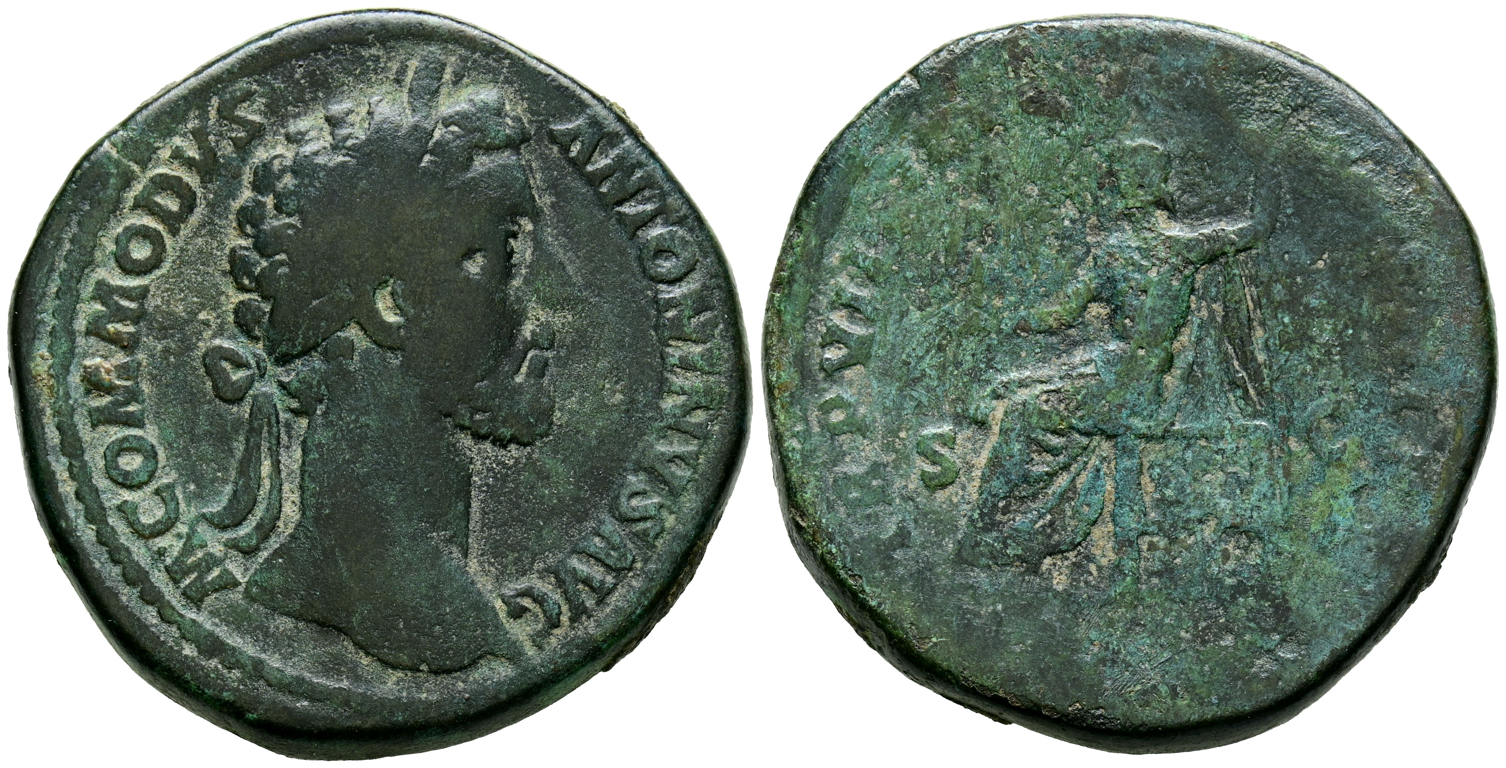 COMODO. Sestercio. (Ae. 26,08g/34mm). 183 d.C. Roma. (RIC 367). Anv: Cabeza laureada de Cómodo a derecha, alrededor leyenda: M COMMODVS ANTONINVS AVG. Rev: Júpiter sentado a izquierda portando lanza y Victoria con corona de laurel, entre S-C, alrededor leyenda: TR P VIII IMP VI COS IIII P P. MBC/MBC-.
