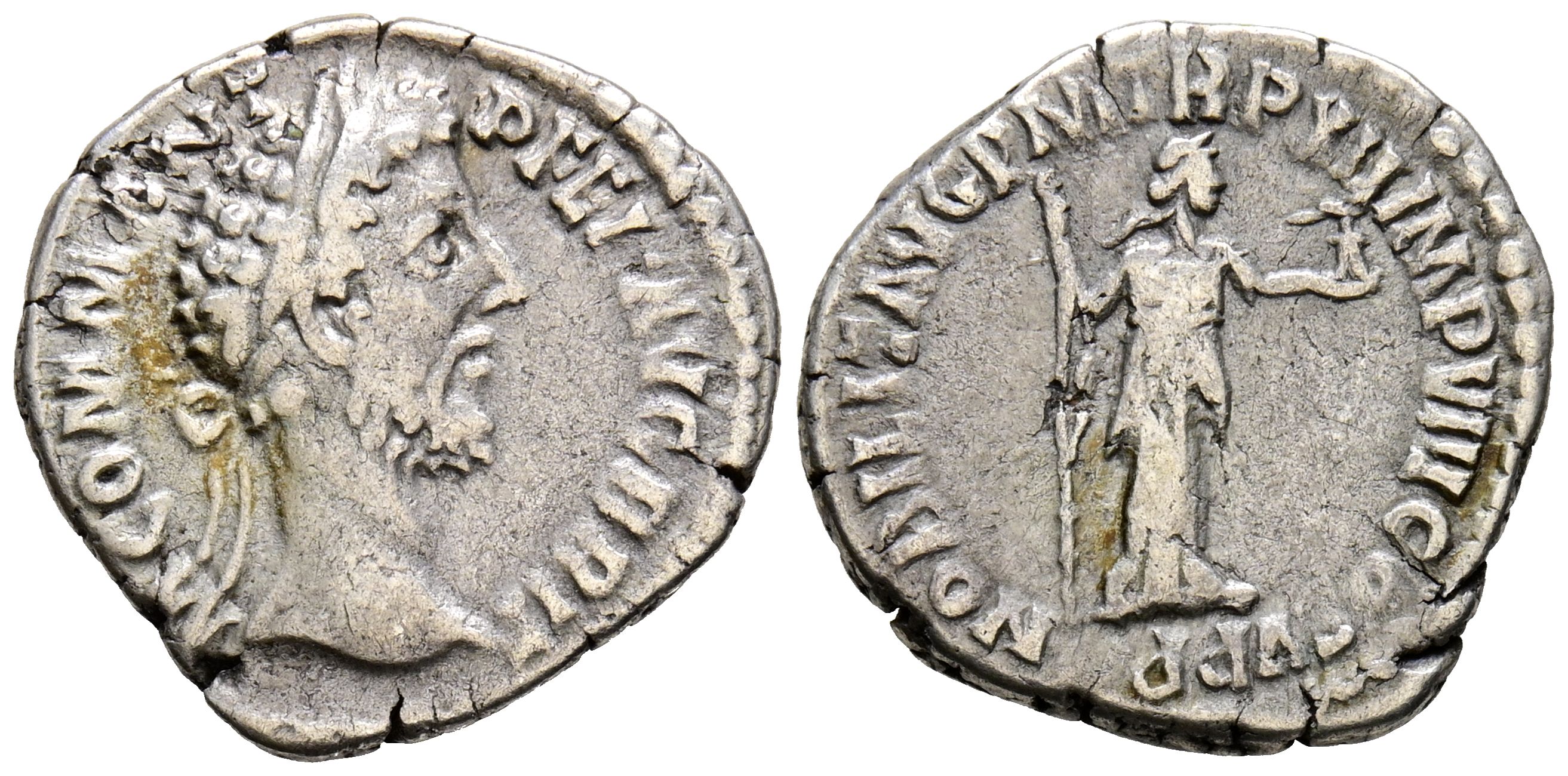 COMODO. Denario. (Ar. 2,69g/18mm). 187-188 d.C. Roma. (RIC 155). Anv: Cabeza laureada de Cómodo a derecha, alrededor leyenda: M COMM ANT P FEL AVG BRIT. Rev: Nobilitas estante a derecha portando cetro y estatuilla, alrededor leyenda: NOBILIT AVG P M TR P XII IMP VIII COS V P P. MBC.