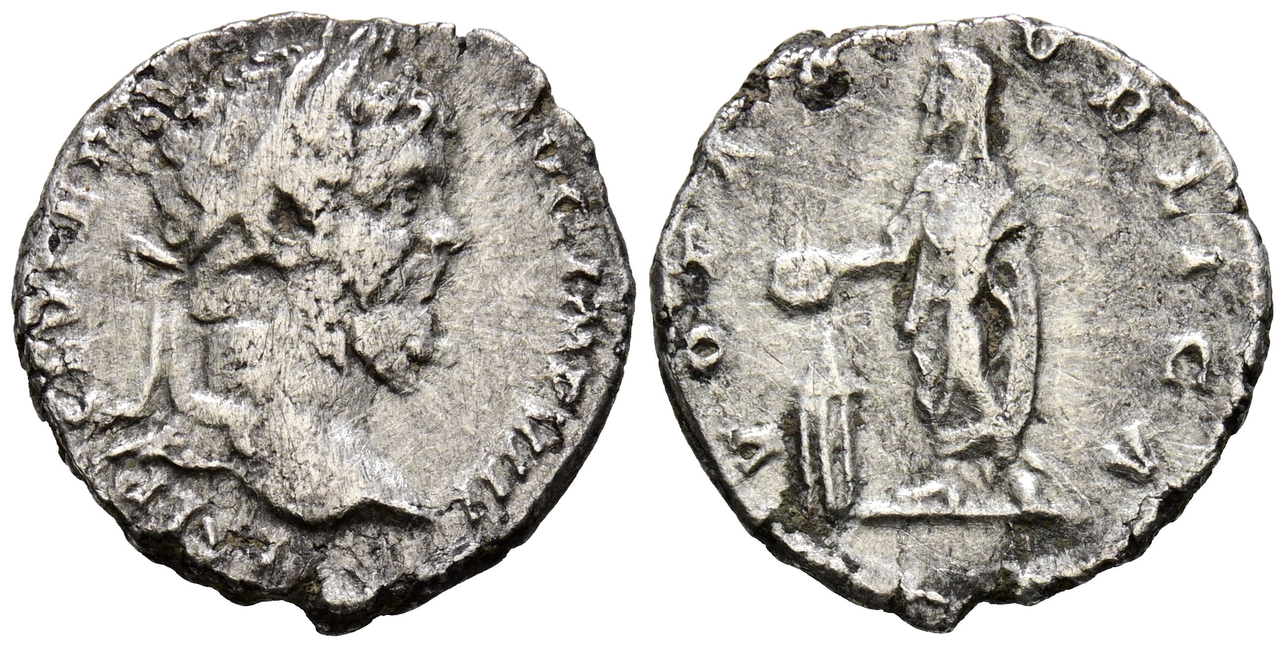 SEPTIMIO SEVERO. Denario. (Ar. 3,06g/18mm). 196-197 d.C. Roma. (RIC 96a). Anv: Busto laureado de Septimio Severo a derecha, alrededor leyenda: L SEPT SEV PERT AVG IMP VIII. Rev: Septimio Severo estante a izquierda con toga y realizando sacrificio con pátera sobre trípode, alrededor leyenda: VOTA PVBLICA. MBC.