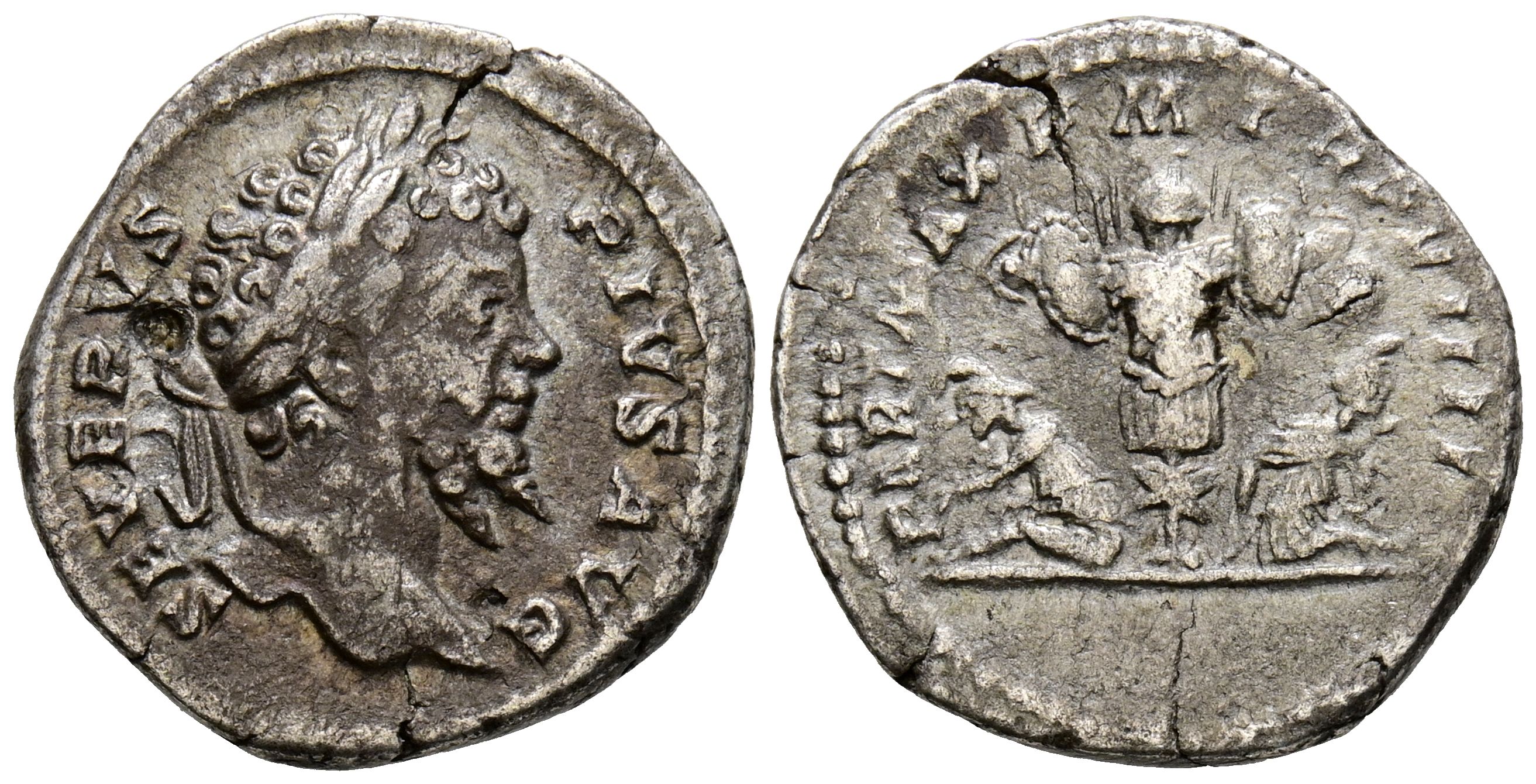 SEPTIMIO SEVERO. Denario. (Ar. 3,02g/18mm). 201 d.C. Roma. (RIC 176). Anv: Cabeza laureada de Septimio Severo a derecha, alrededor leyenda: SEVERVS PIVS AVG. Rev: Trofeo entre dos cautivos sentados, alrededor leyenda: PART MAX P M TR P VIIII. MBC/MBC-.