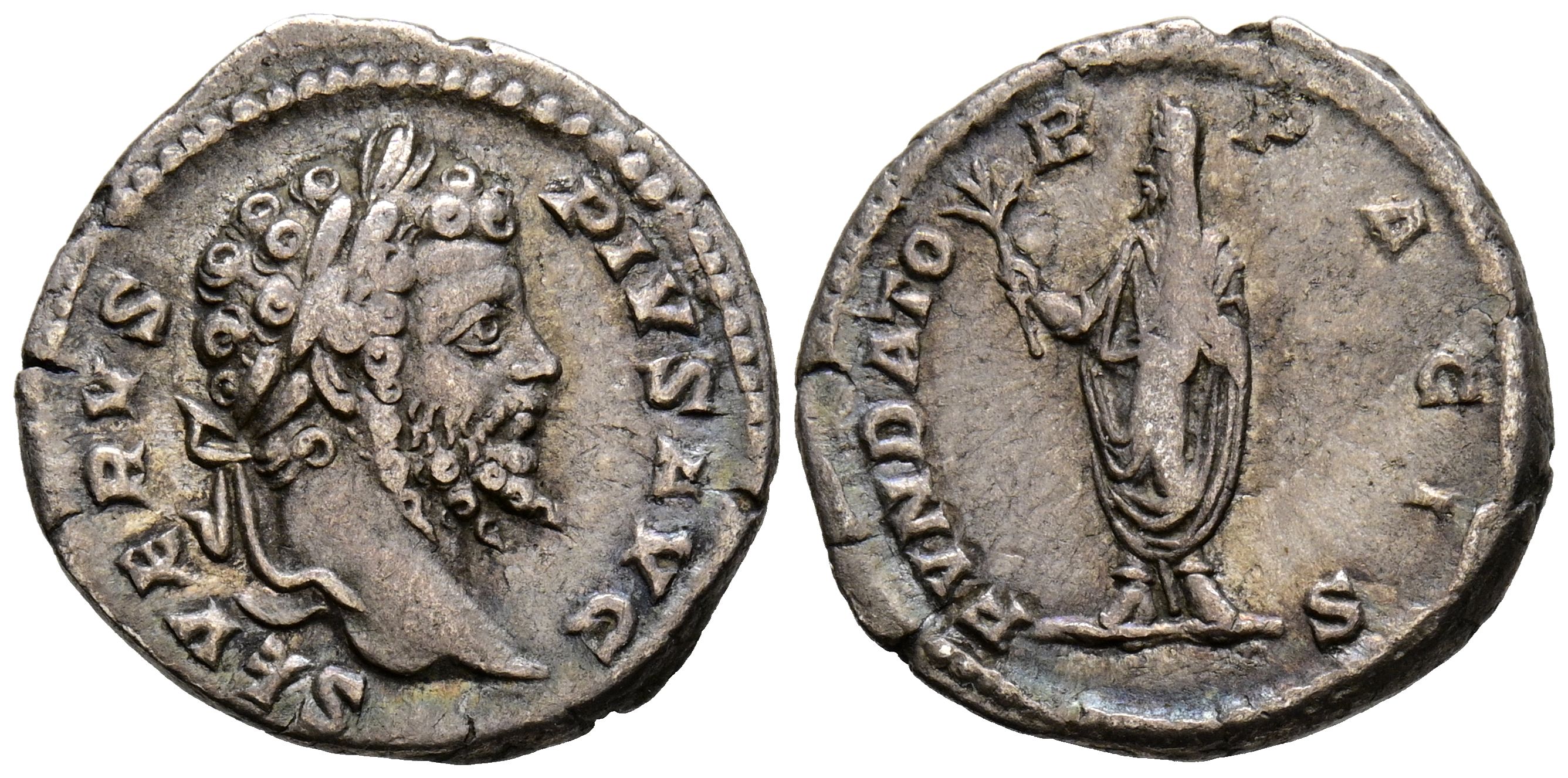 SEPTIMIO SEVERO. Denario. (Ar. 3,10g/19mm). 201 d.C. Roma. (RIC 190). Anv: Busto laureado de Septimio Severo a derecha, alrededor leyenda: SEVERVS PIVS AVG. Rev: Septimio Severo estante a izquierda portando rama, alrededor leyenda: FVNDATOR PACIS. MBC.