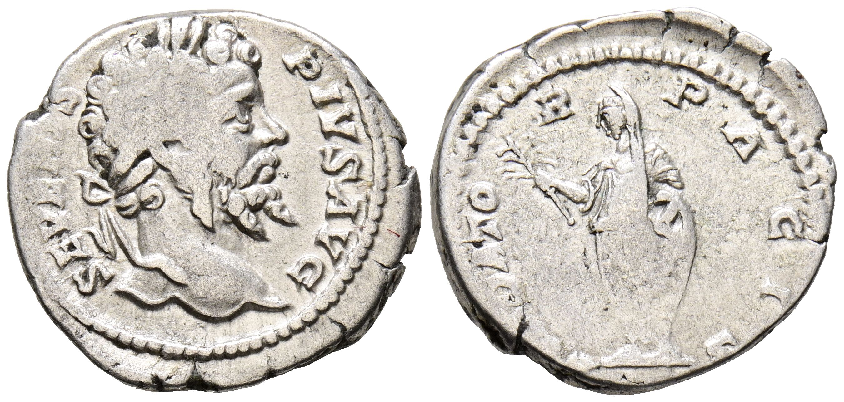 SEPTIMIO SEVERO. Denario. (Ar. 3,28g/19mm). 202-210 d.C. Roma. (RIC 265). Anv: Cabeza laureada de Septimio Severo a derecha, alrededor leyenda: SEVERVS PIVS AVG. Rev: Septimio Severo a izquierda portando rama, alrededor leyenda: FVNDATOR PACIS. MBC-.