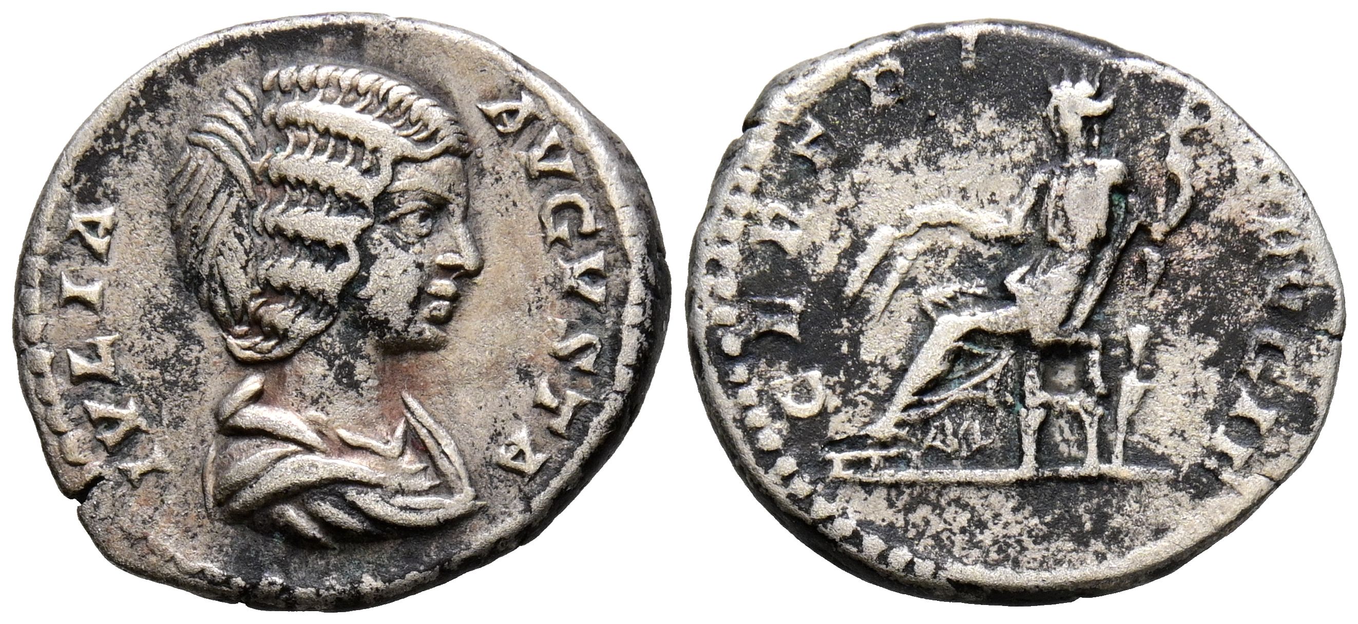 JULIA DOMNA. Denario. (Ar. 3,35g/18mm). 196-211 d.C. Antioquía. (RIC 546). Anv: Busto drapado de Julia Domna a derecha, alrededor leyenda: IVLIA AVGVSTA. Rev: Ceres sentada a izquierda portando espigas y cetro, alrededor leyenda: CERERI FRVGIF. MBC/MBC-.