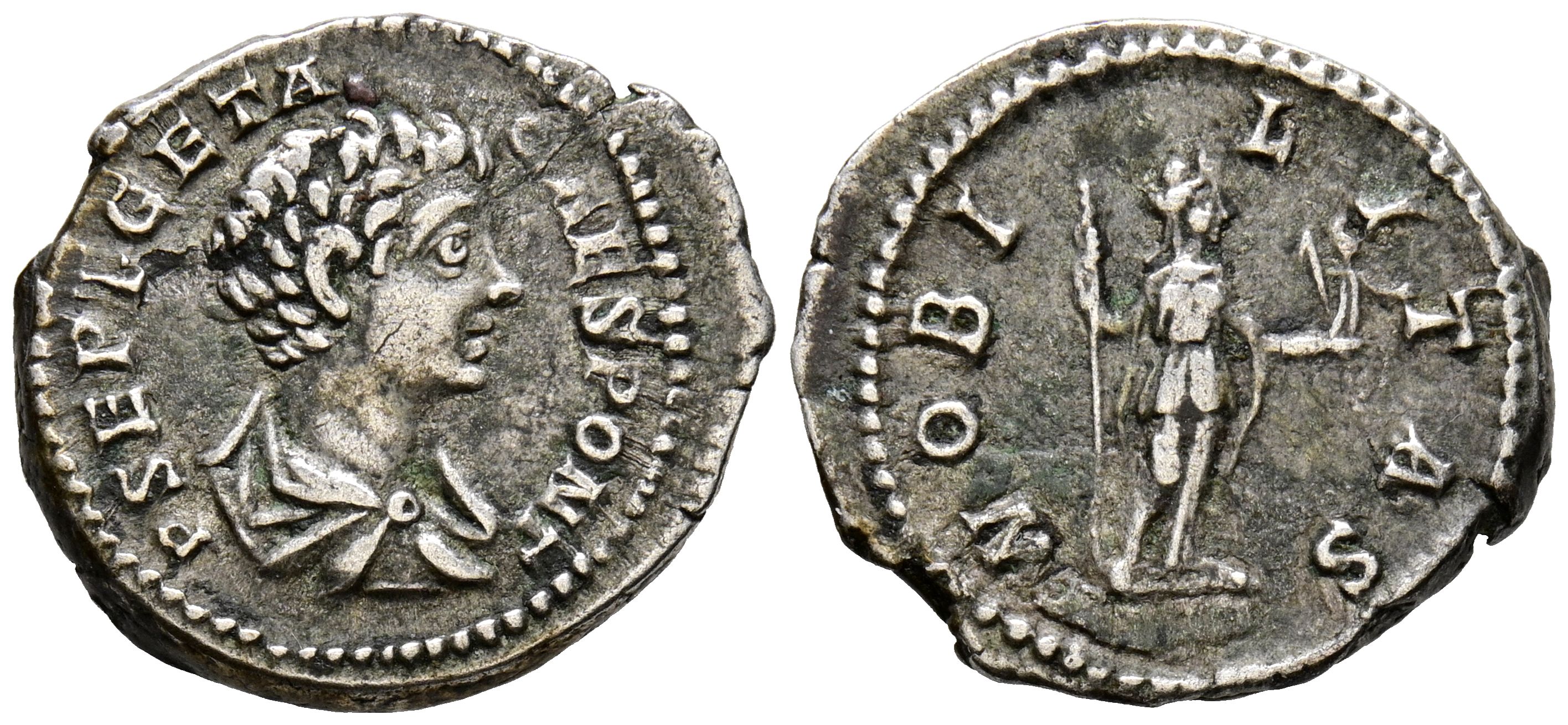 GETA. Denario. (Ar. 3,25g/20mm). 200-202 d.C. Roma. (RIC 13a). Anv: Busto drapeado de Geta a derecha, alrededor leyenda: P SEPT GETA CAES PONT. Rev: Nobilitas estante a derecha portando cetro y Victoria, alrededor leyenda: NOBILITAS. MBC.
