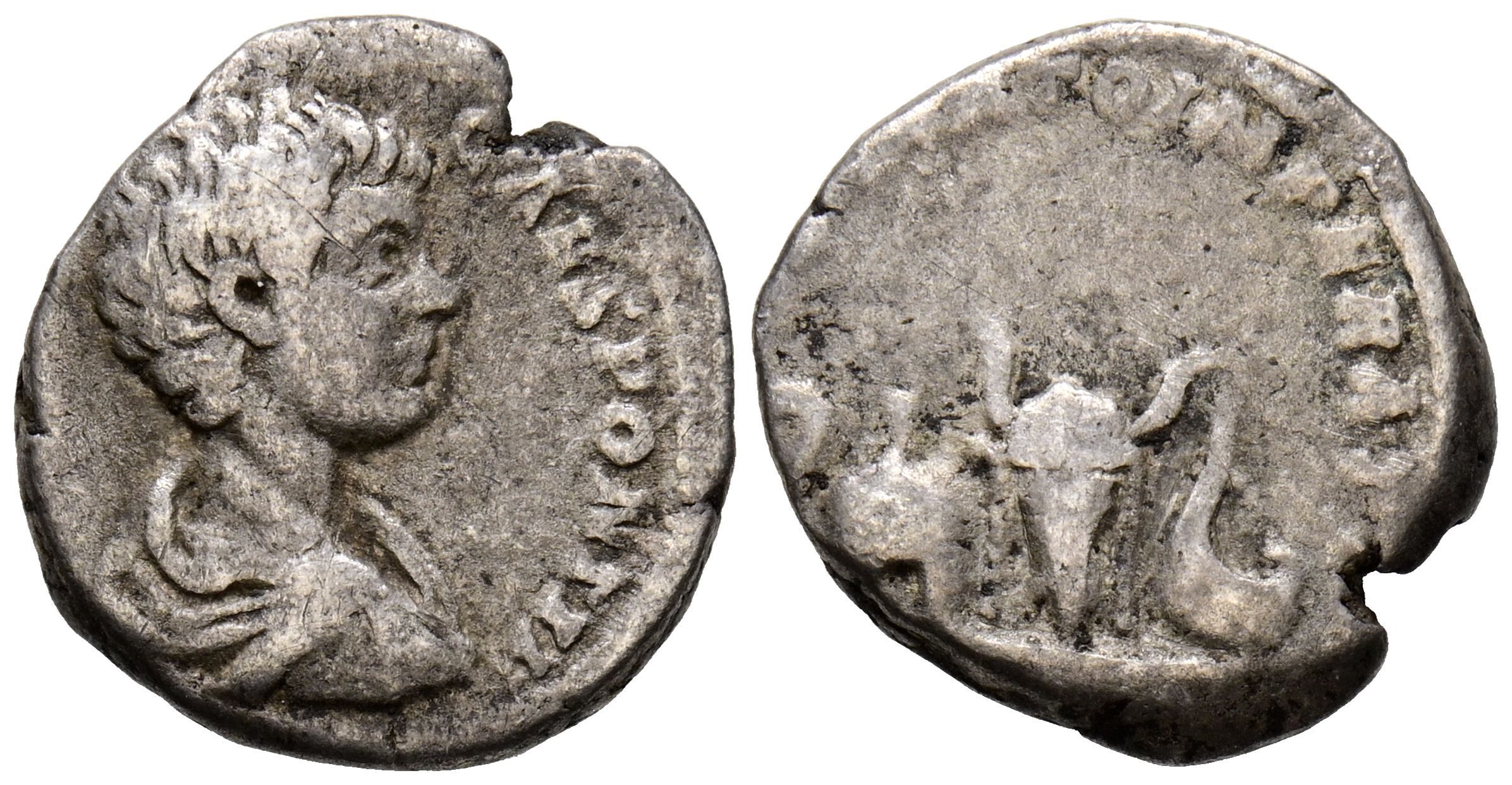 CARACALLA. Denario. (Ar. 3,13g/17mm). 196-198 d.C. Roma. (RIC 6). Rev: Busto drapeado de Caracalla a la derecha, alrededor de la leyenda: M AVR ANTON CAES PONTIF. Rev: Elementos sacerdotales, alrededor leyenda: DESTINATO IMPERAT. BC+.