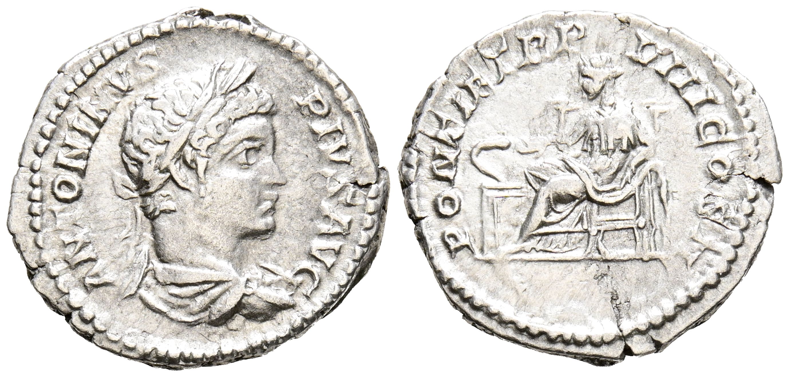 CARACALLA. Denario. (Ar. 2,80g/18mm). 205 d.C. Roma. (RIC 82). Anv: Busto laureado y drapeado a derecha de Caracalla, alrededor leyenda: ANTONINVS PIVS AVG. Rev: Salus sentada a izquierda con pátera alimentando a serpiente sobre altar, alrededor leyenda: PONTIF TR P VIII COS II. MBC+.
