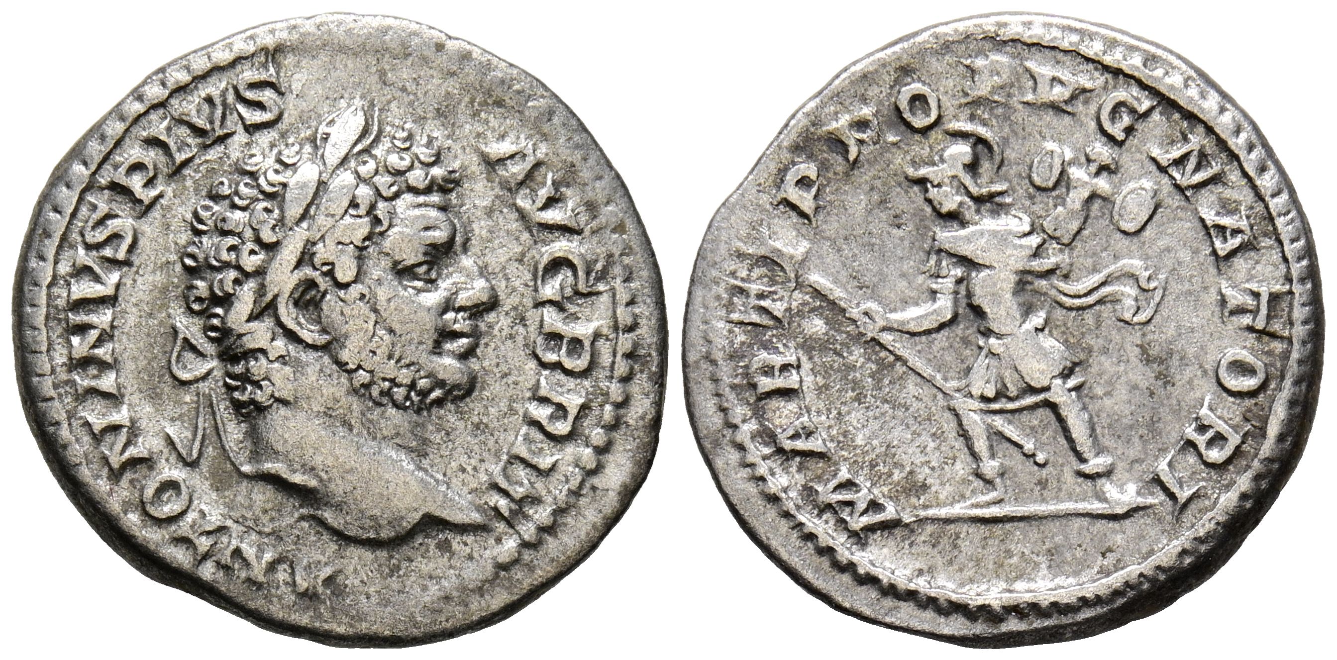 CARACALLA. Denario. (Ar. 2,89g/19mm). 210-213 d.C. Roma. (RIC 223). Anv: Busto laureado de Caracalla a derecha, alrededor leyenda: ANTONINVS PIVS AVG BRIT. Rev: Marte avanzando a izquierda portando lanza y trofeo, alrededor leyenda: MARTI PROPVGNATORI. MBC+.