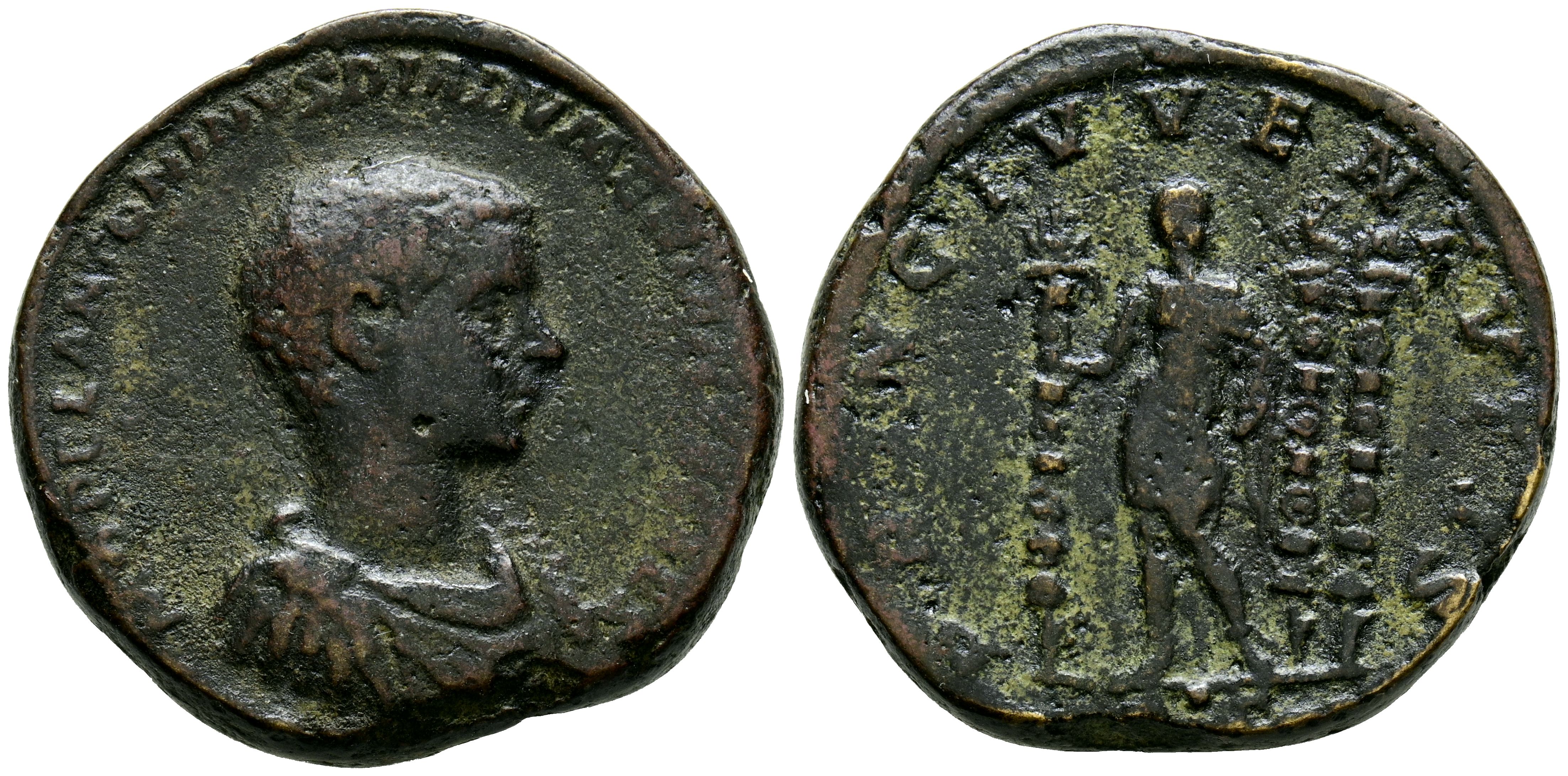 DIADUMENIANO. Sestercio. (Ae. 20,90g/33mm). 217-218 d.C. Roma. (RIC 211). Anv: Busto drapeado y con coraza de Diadumeniano a derecha, alrededor leyenda: M OPEL ANTONINVS DIADVMENIANVS CAES. Rev: Diadumeniano estante a dercha portando cetro y estandarte, delante dos estandartes, en exergo: SC, alrededor leyenda: PRINC IVVENTVTIS. BC+. Campos rebajados.
