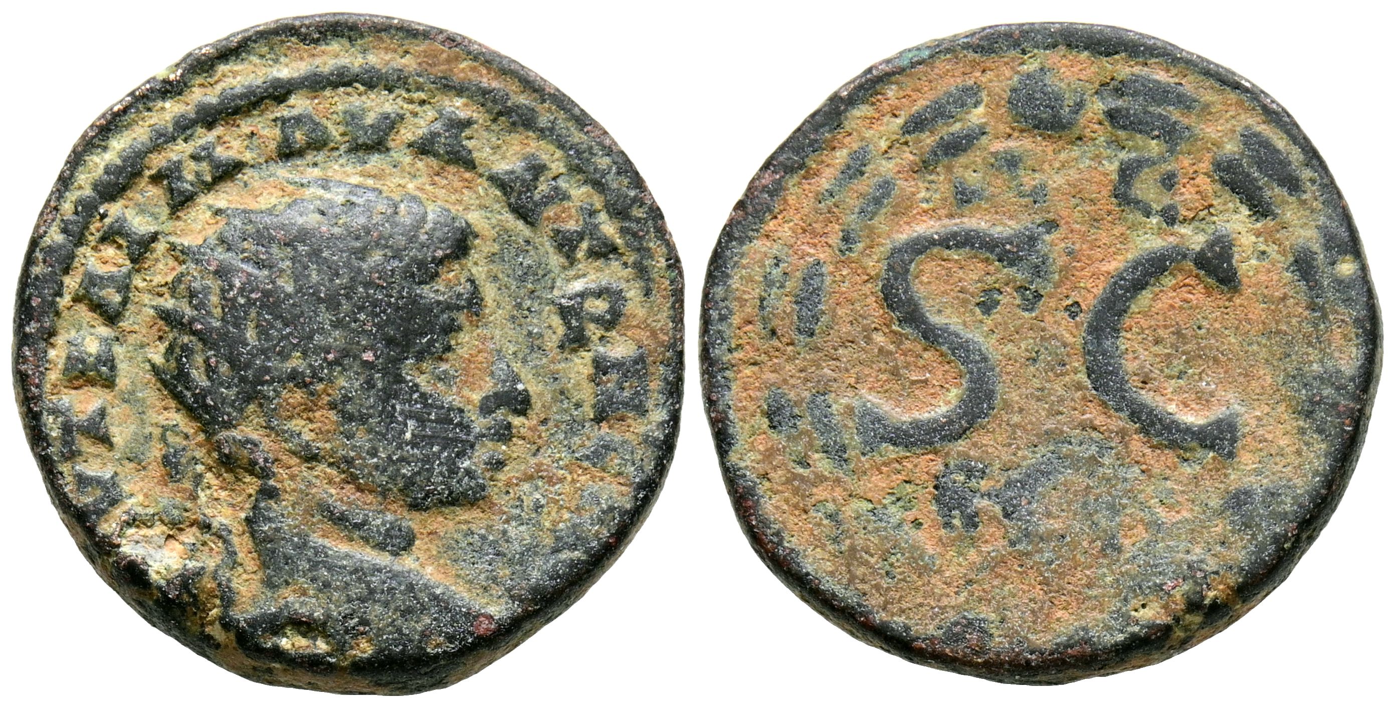 HELIOGABALO. Ae18. (Ae. 5,26g/19mm). 218-222 d.C. Seleucis y Pieria, Antioquía. (McAlee 782-783). Anv: Cabeza laureada de Heliogábalo a derecha, alrededor leyenda: AVT KAI M AV ANTΩNԐINOC CԐ. Rev: SC, encima AE, debajo águila, todo dentro de corona de laurel. MBC-.