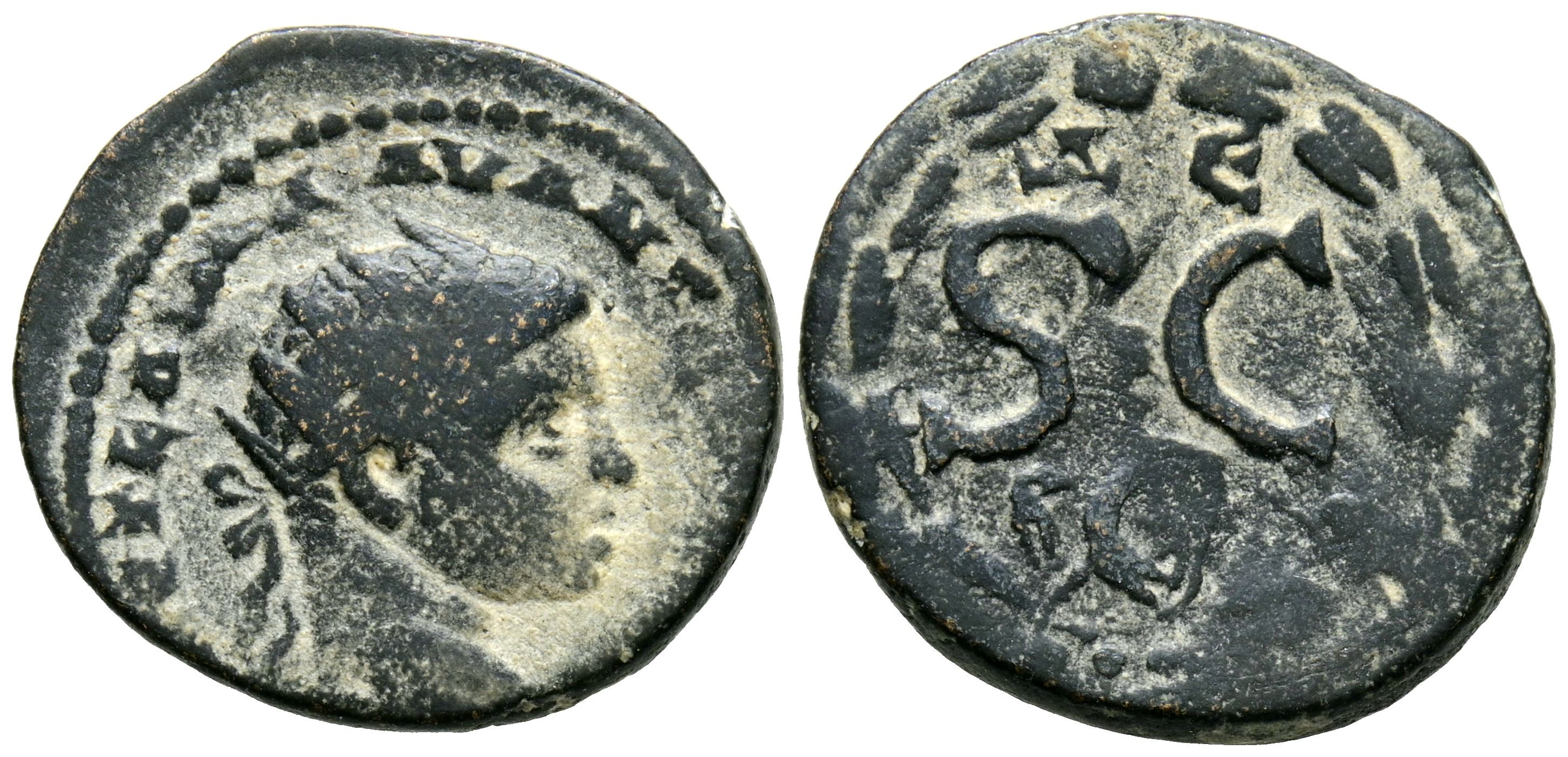 HELIOGABALO. Ae20. (Ae. 4,60g/20mm). 218-222 d.C. Seleucis y Pieria, Antioquía. (McAlee 782-783). Anv: Cabeza laureada de Heliogábalo a derecha, alrededor leyenda: AVT KAI M AV ANTΩNⱭINOC CⱭ. Rev: SC, encima AE, debajo águila, todo dentro de corona d e laurel. MBC-.
