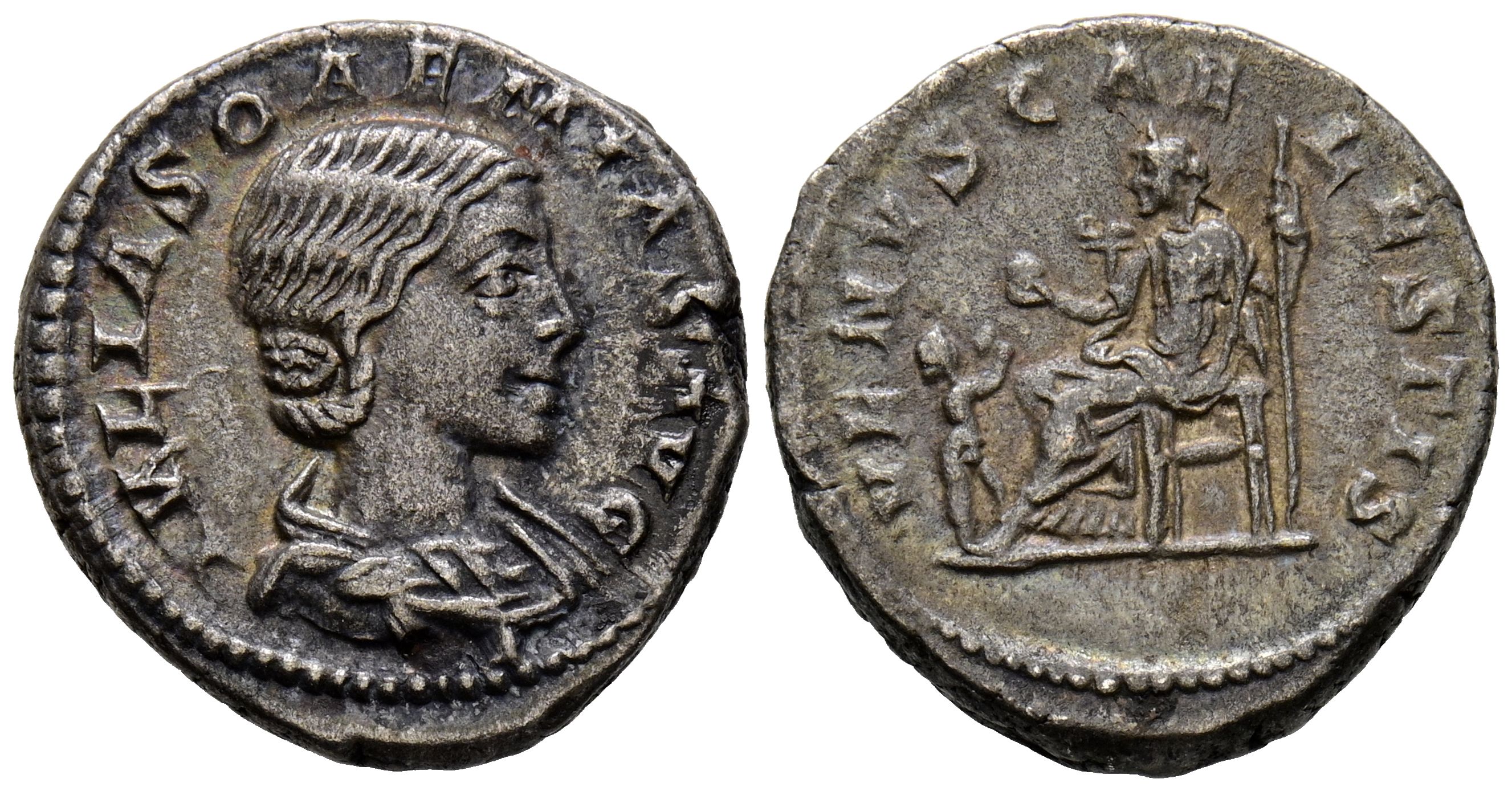 JULIA SOAEMIAS. Denario. (Ar. 3,95g/19mm). 218-222 d.C. Antioquía. (RIC 243). Anv: Busto drapeado de Julia Soaemias a derecha, alrededor leyenda: IVLIA SOAEMIAS AVG. Rev: Venus sentada a izquierda sosteniendo manzana y cetro, a sus pies niño, alrededor leyenda: VENVS CAELESTIS. MBC.