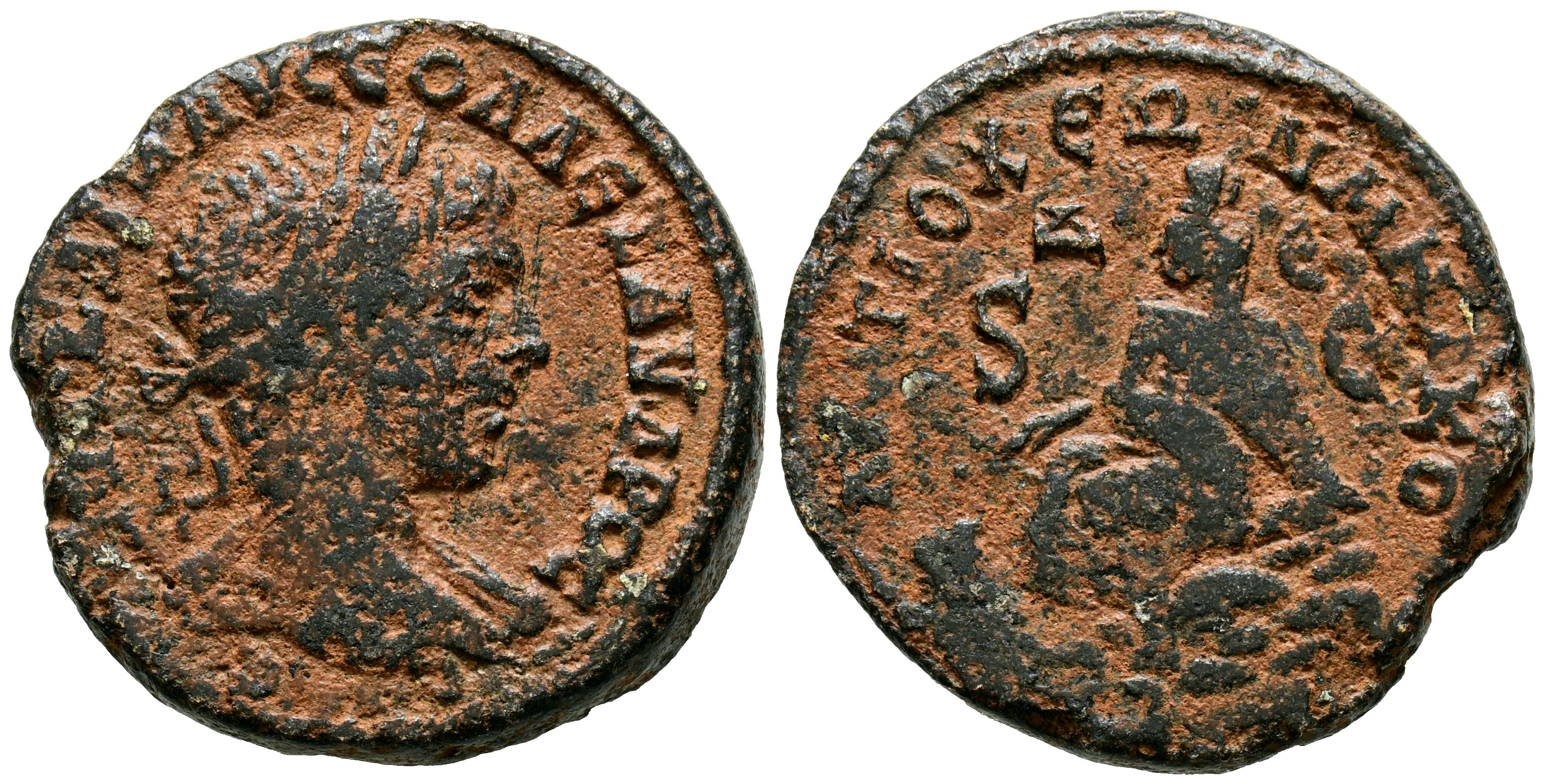 ALEJANDRO SEVERO. Octassarion. (Ae. 9,70g/25mm). 222-235 d.C. Asaria, Antioquía. (RPC 8086; McAlee 828). Anv: Cabeza laureada de Alejandro severo a derecha, alrededor leyenda: ΑΥΤΟ ΚΑΙϹ ΜΑΡ ΑΥΡ ϹЄ ΑΛЄΞΑΝΔΡ ϹЄΒ. Rev: Tyche sedente a la izquierda en las rocas, sosteniendo la espiga de grano, a los pies, dios del río nadando a la izquierda, en campo: Δ-Є y S-C, alrededor leyenda: ΑΝΤΙΟXЄΩΝ ΜΗ Κ. MBC-.