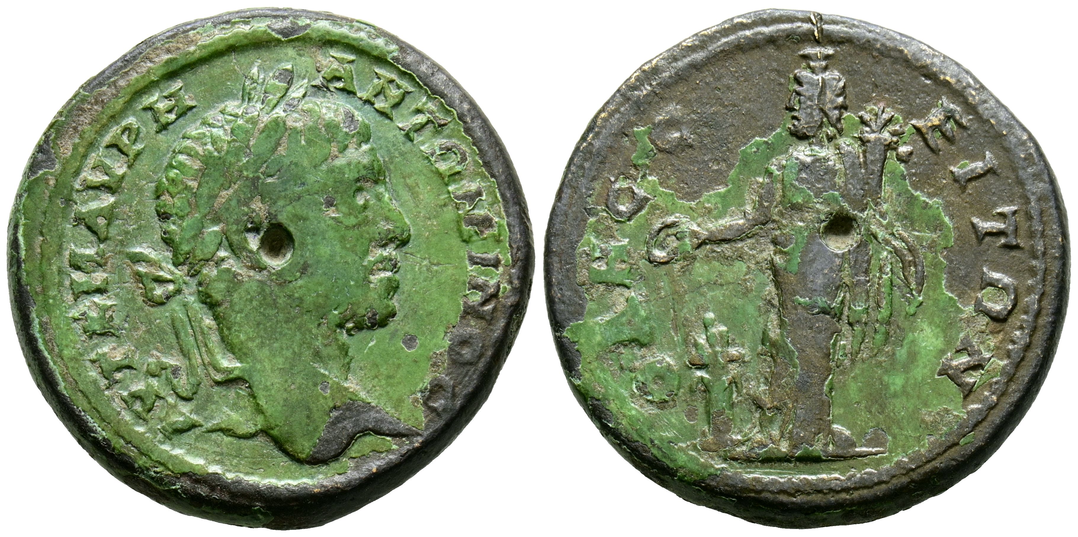 ALEJANDRO SEVERO. Ae25. (Ae. 10,76g/25mm). 222-235 d.C. Odessus, Moesia inferior. (AMNG 2310; Varbanov 4425). Anv: Cabeza laureada de Alejandro Severo a derecha, alrededor leyenda: M AVPH AΛEΞANΔPOC KAIC. Rev: Gran Dios de Odessus estante a la izquierda, portando patera sobre altar de sacrifício y cornucopia, alrededor leyenda: OΔHCCEITΩN. MBC.