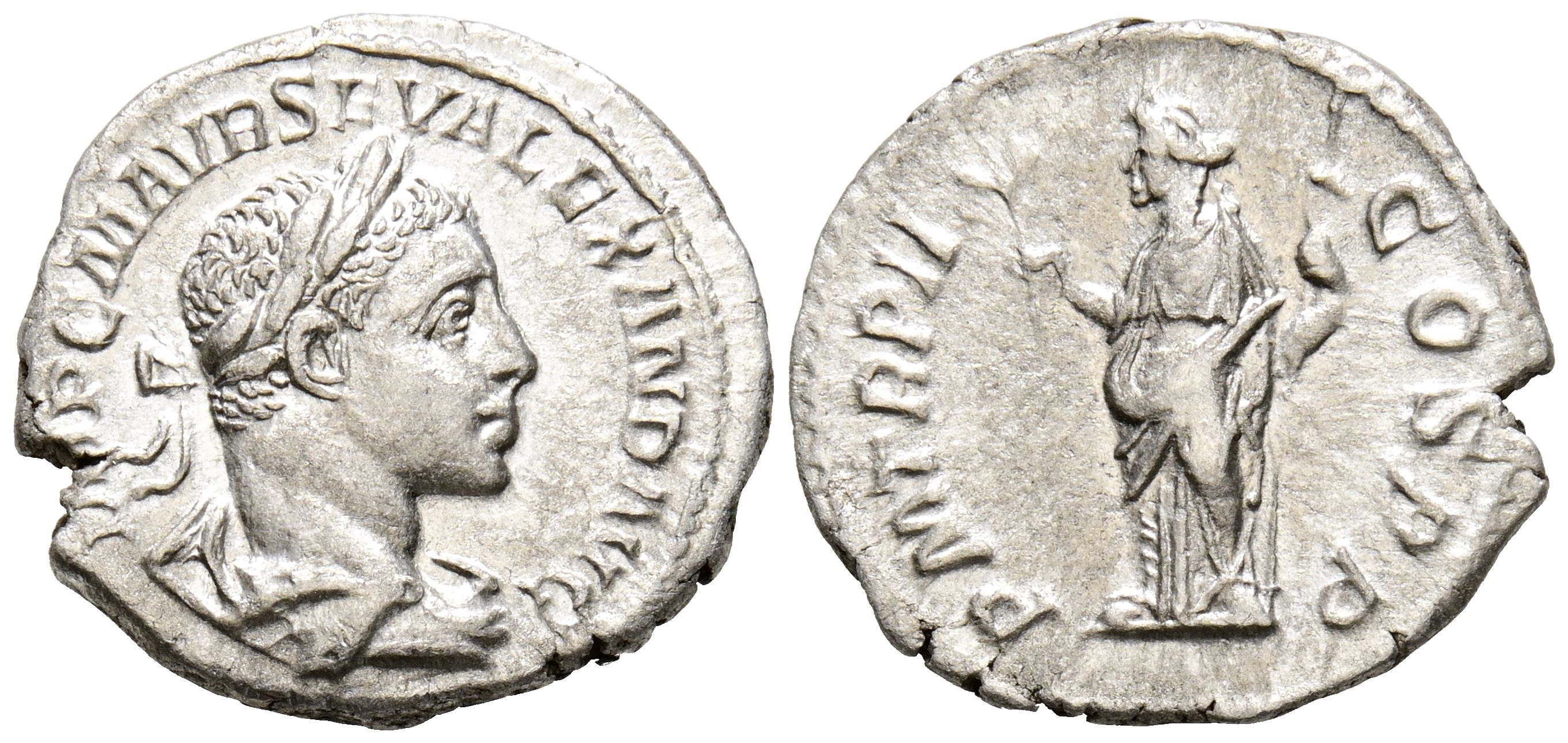 ALEJANDRO SEVERO. Denario. (Ar. 2,62g/19mm). 223 d.C. Roma. (RIC 27). Anv: Busto laureado y drapeado de Alejandro Severo a derecha, alrededor leyenda: IMP C M AVR SEV ALEXAND AVG. Rev: Pax estante a izquierda portando rama de olivo y cetro, alrededor leyenda: P M TR P II COS P P. MBC+.
