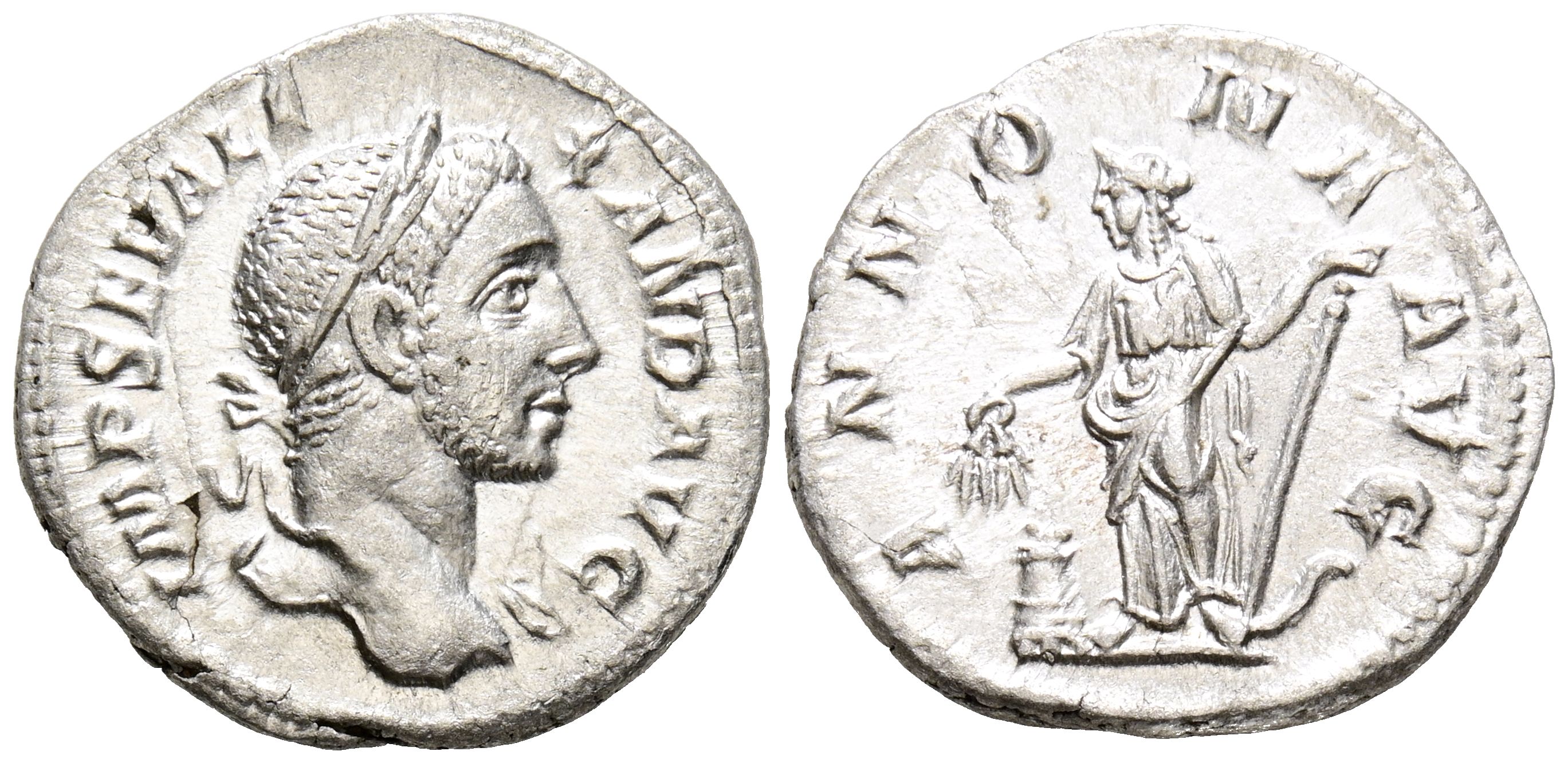 ALEJANDRO SEVERO. Denario. (Ar. 2,82g/19mm). 228 d.C. Roma. (RIC 135). Anv: Busto laureado y drapeado de Alejandro Severo a derecha, alrededor leyenda: IMP C M AVR SEV ALEXAND AVG. Rev: Annona estante a izquierda portando espigas sobre modio y cornucopia, alrededor leyenda: ANNONA AVG. MBC+.
