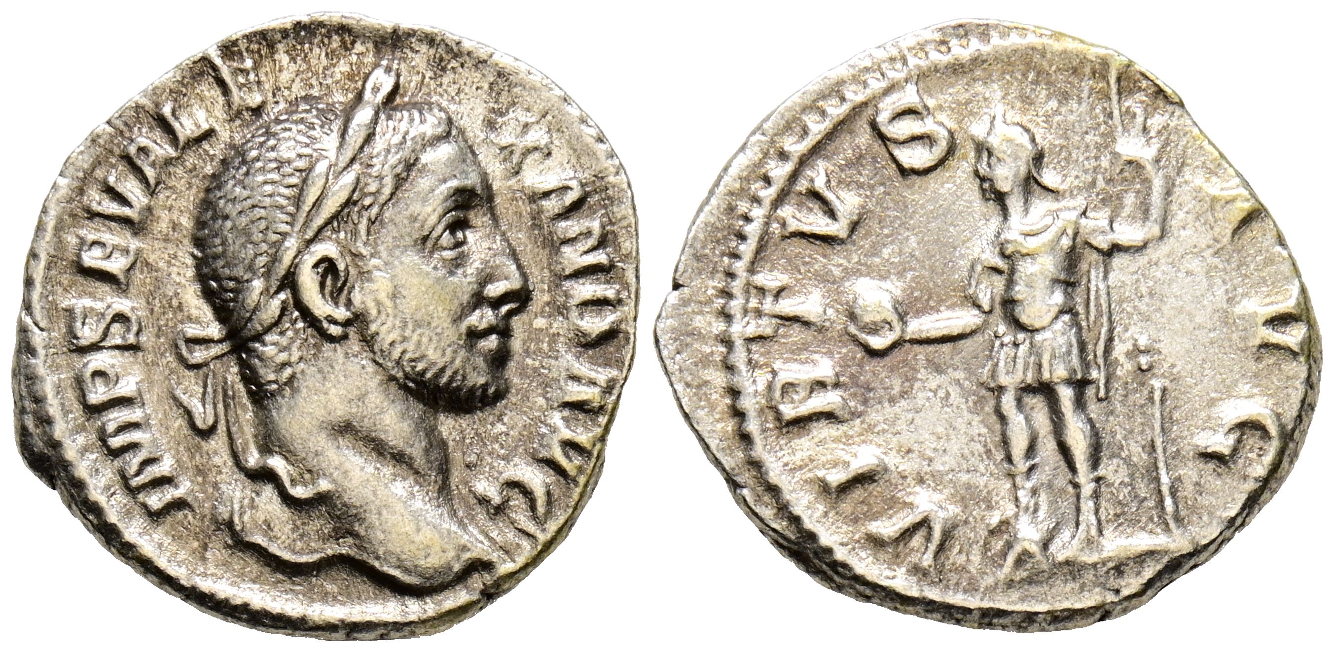 ALEJANDRO SEVERO. Denario, (Ar. 3,16g /19mm). 228-231 d.C. Roma. (RIC 226). Anv: Busto laureado de Alejandro Severo a la derecha, alrededor de la leyenda: IMP SEV ALEXAND AVG. Rev: Alejandro Severo estante izquierdo con el pie en el casco, sosteniendo el globo y el cetro, alrededor de la leyenda: VIRTVS AVG. MBC.
