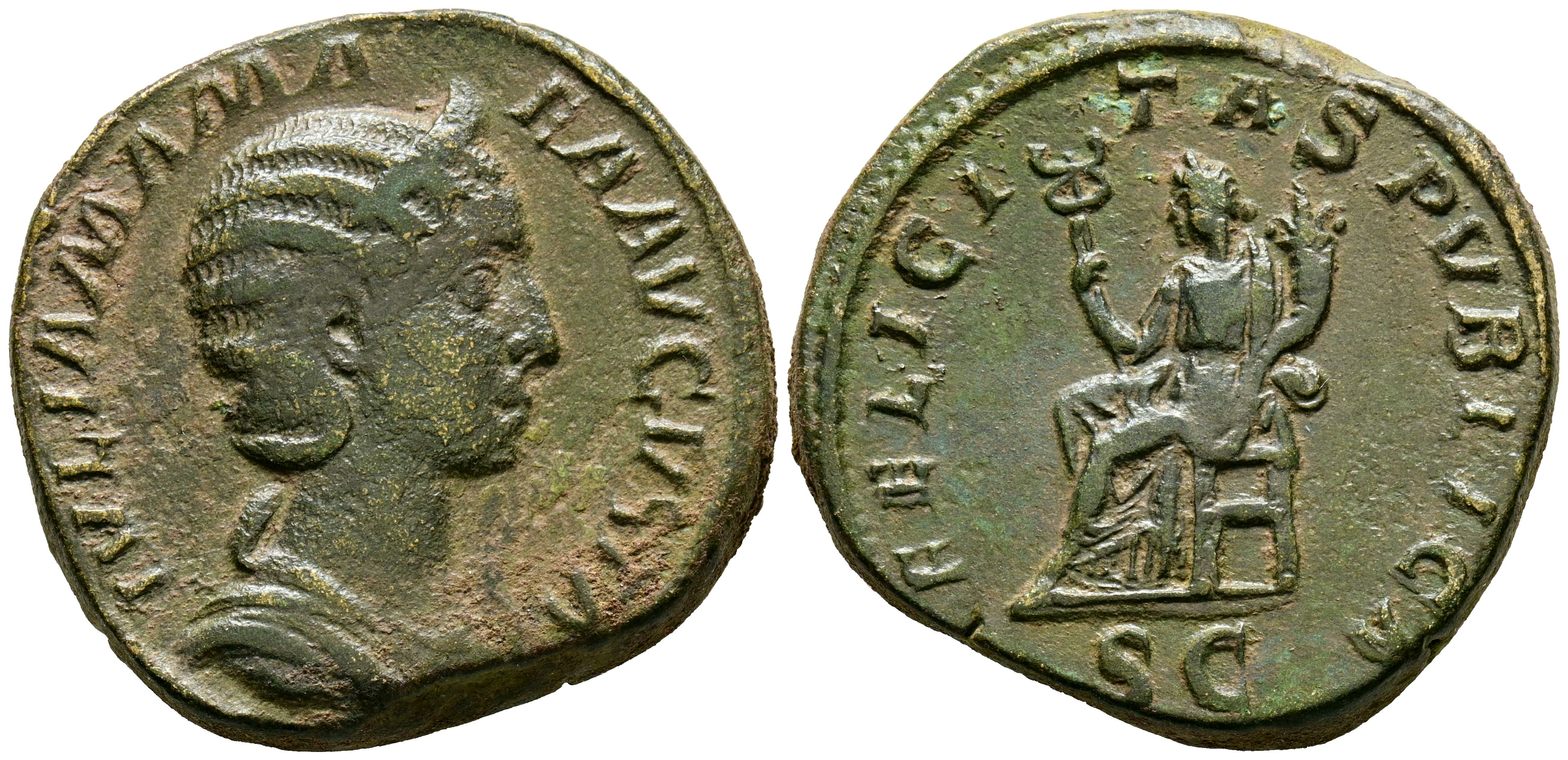 JULIA MAMAEA. Sestercio. (Ae. 23,22g/30mm). 230 d.C. Roma. (RIC 679). Anv: Busto diademado y drapeado de Julia Mamaea a derecha, alrededor leyenda: IVLIA MAMAEA AVGVSTA. Rev: Felicitas sentada a izquierda portando caduceo y cornucopia, en exergo: SC, alrededor leyenda: FELICITAS PVBLICA. MBC/MBC+.