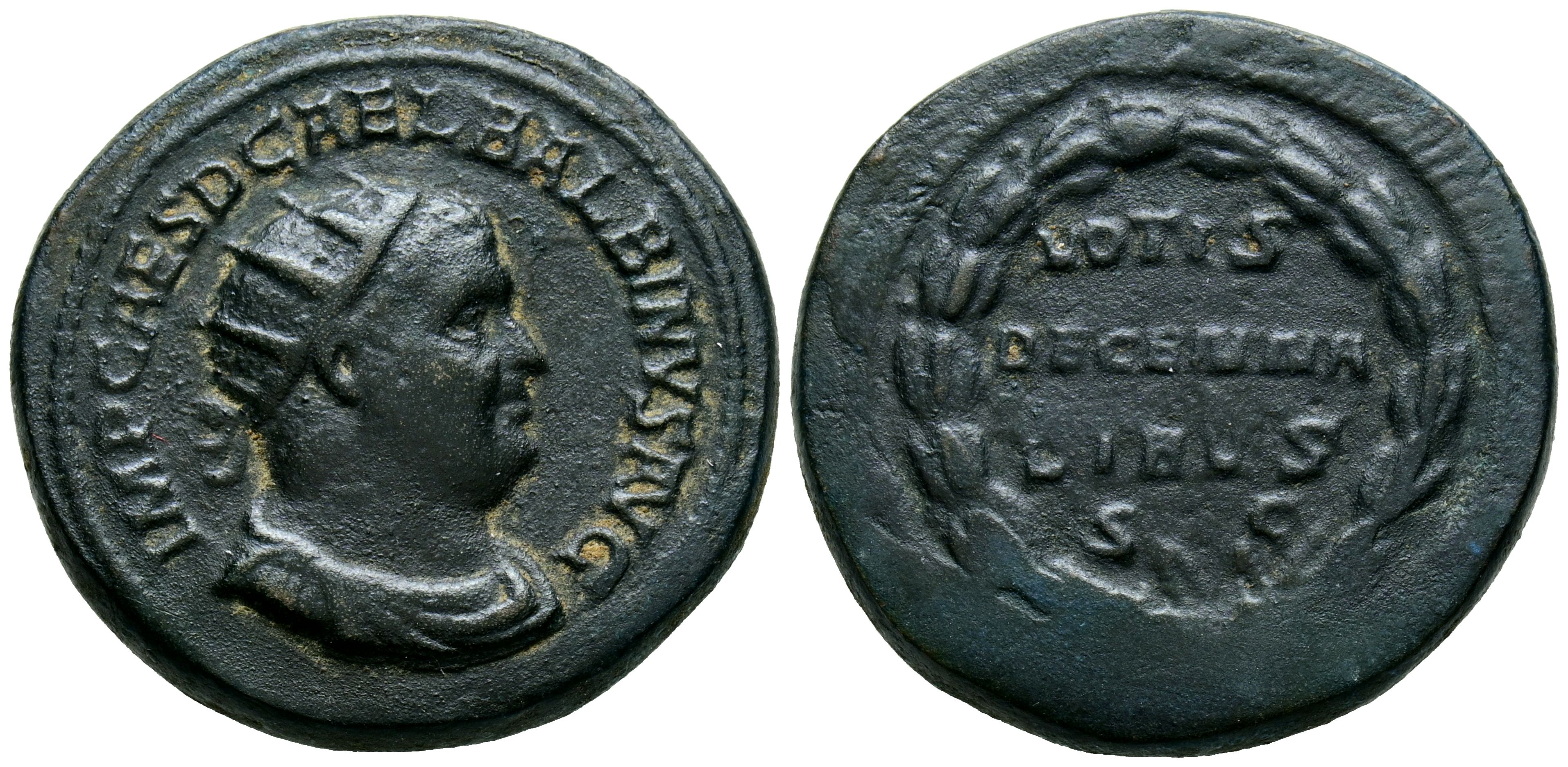 BALBINO. Dupondio. (Ae. 12,99g/27mm). 238 d.C. Roma. (RIC 21). Anv: Busto radiado y drapeado de Balbino a derecha, alrededor leyenda: IMP CAES D CAEL BALBINVS AVG. Rev: VOTIS/DECENNA/LIBVS/SC, dentro de corona de laurel. MBC. Retocado. Escaso ejemplar.