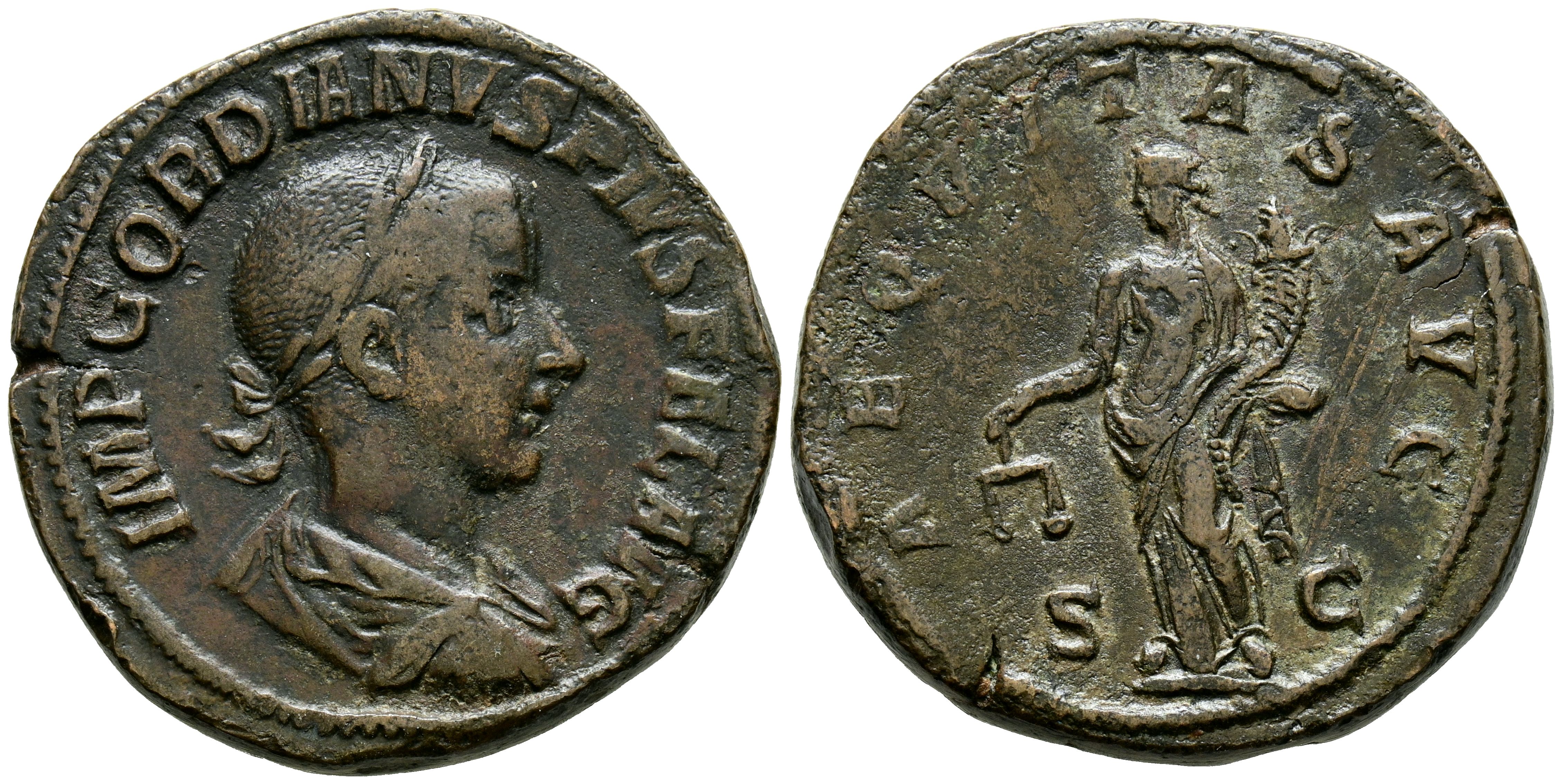 GORDIANO III. Sestercio. (Ae. 19,99g/32mm). 240 d.C. Roma. (RIC 286a). Anv: Busto laureado y drapeado de Gordiano III a derecha, alrededor leyenda: IMP GORDIANVS PIVS FEL AVG. Rev: Aequitas estante a izquierda portando cornucopia y escalas, entre: S-C, alrededor leyenda: AEQVITAS AVG. MBC-.