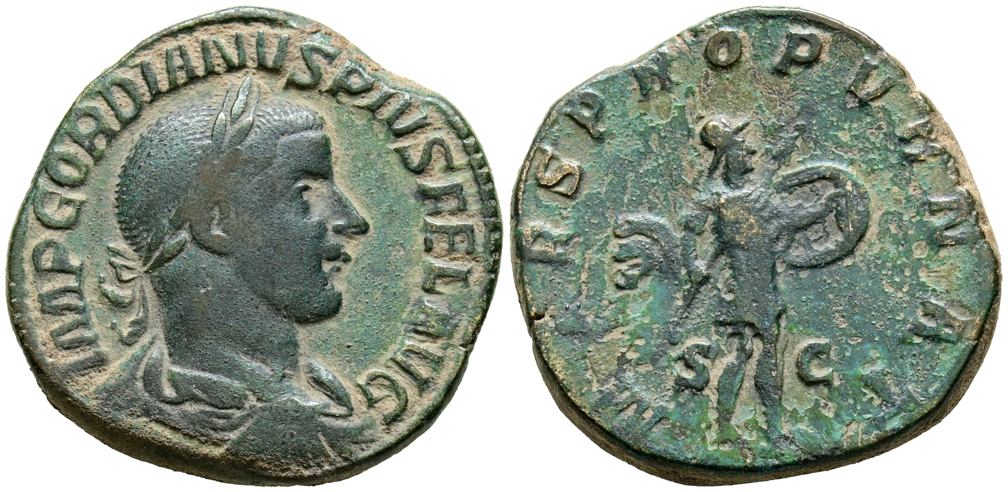 GORDIANO III. Sestercio. (Ae. 19,01g/30mm). 243-244 d.C. Roma. (RIC 332b). Anv: Busto laureado y drapeado de Gordiano III a derecha, alrededor leyenda: IPM GORDIANVS PIVS FEL AVG. Rev: Marte avanzando a derecha portando lanza y escudo, entre: S-C, alrededor leyenda: MARS PROPVGNAT. MBC-. Campos repasados.