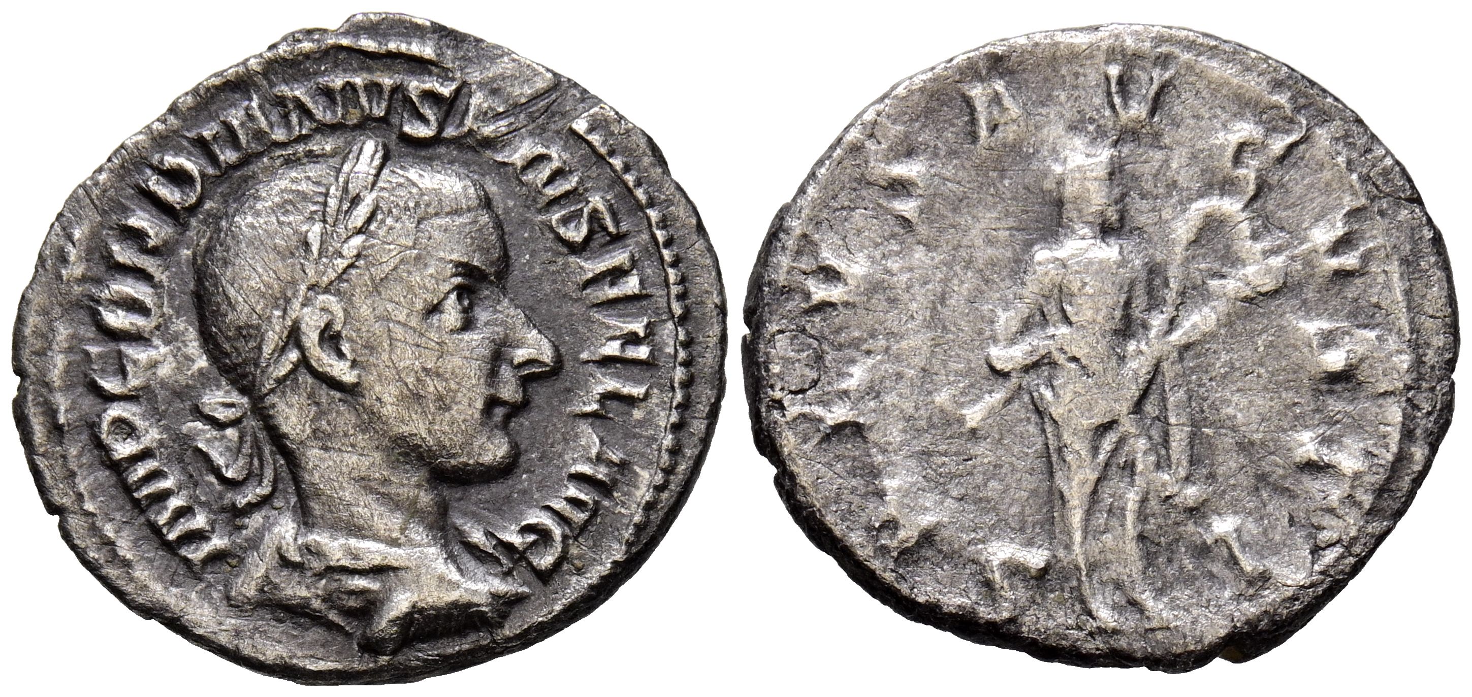 GORDIANO III. Denario. (Ar. 2,35g/20mm). 241 d.C. Roma. (RIC 129a). Anv: Busto laureado y drapeado de Gordiano III a la derecha, alrededor leyenda: IMP GORDIANVS PIVS FEL AVG. Rev: Salus a derecha con serpiente en sus brazos, alrededor leyenda: SALVS AVGVSTI. MBC/MBC-.
