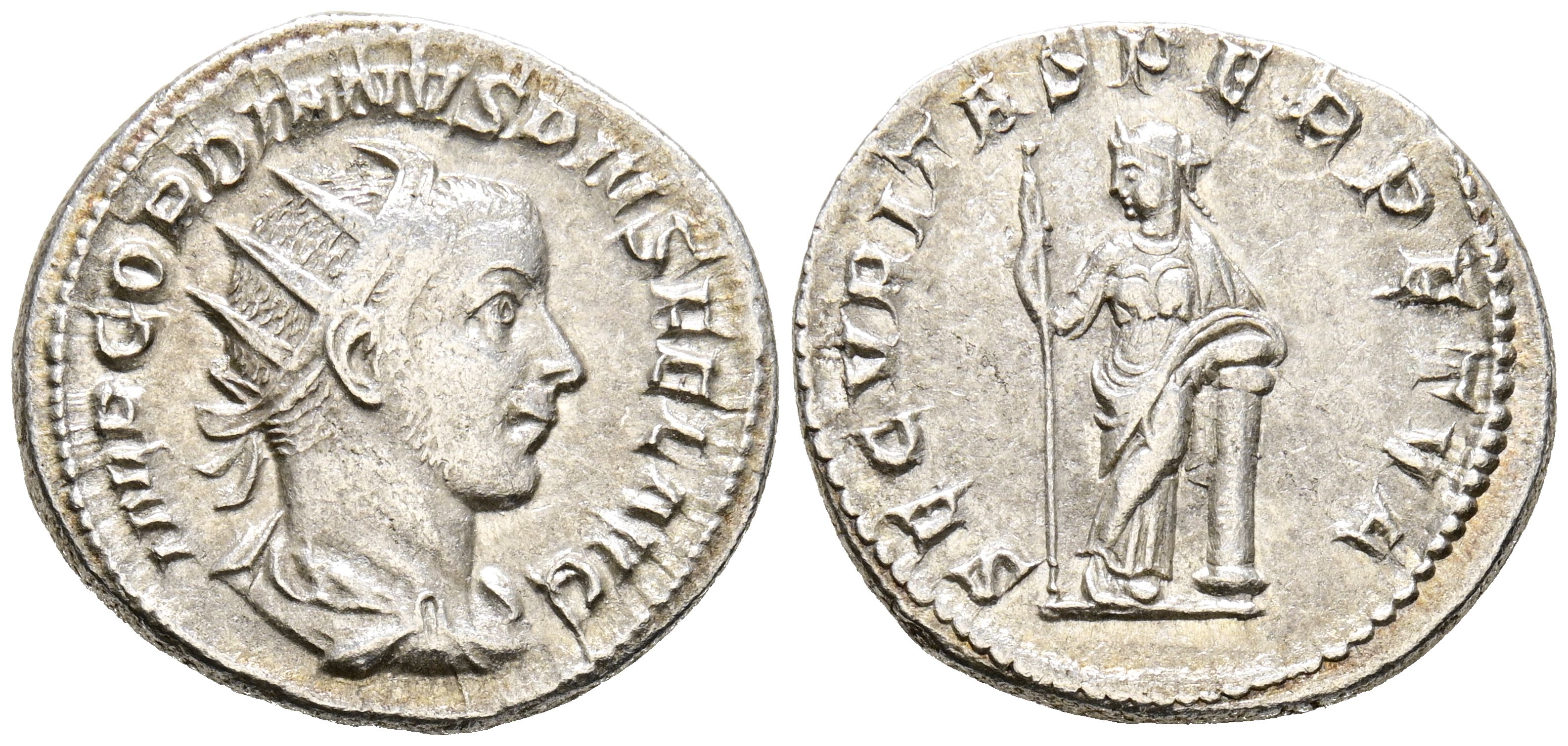 GORDIANO III. Antoniniano. (Ar. 4,94g/24mm). 243-244 d.C. Roma. (RIC 153). Anv: Busto radiado y drapeado de Gordiano III a derecha, alrededor leyenda: IMP GORDIANVS PIVS FEL AVG. Rev: Securitas estante a izquierda portando cetro, alrededor leyenda: SECVRITAS PERPETVA. MBC+.