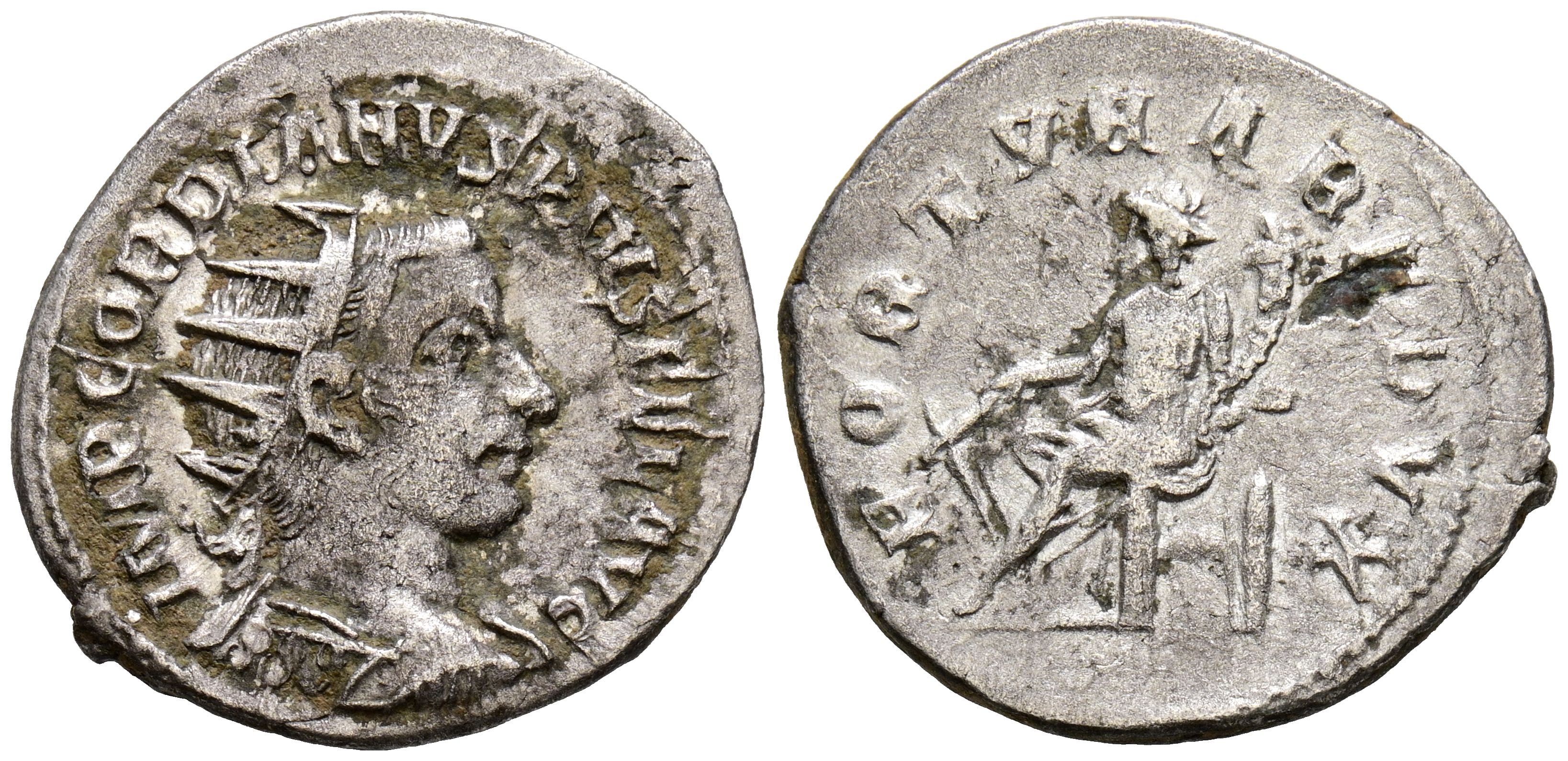 GORDIANO III. Antoniniano. (Ve. 4,29g/24mm). 243-244 d.C. Antioquía. (RIC 210). Anv: Busto radiado, drapeado y con coraza de Gordiano III a derecha, alrededor leyenda: IMP GORDIANVS PIVS FEL AVG. Rev: Fortuna sentada a izquierda portando timón y cornucopia, alrededor leyenda: FORTVNA REDVX. MBC.