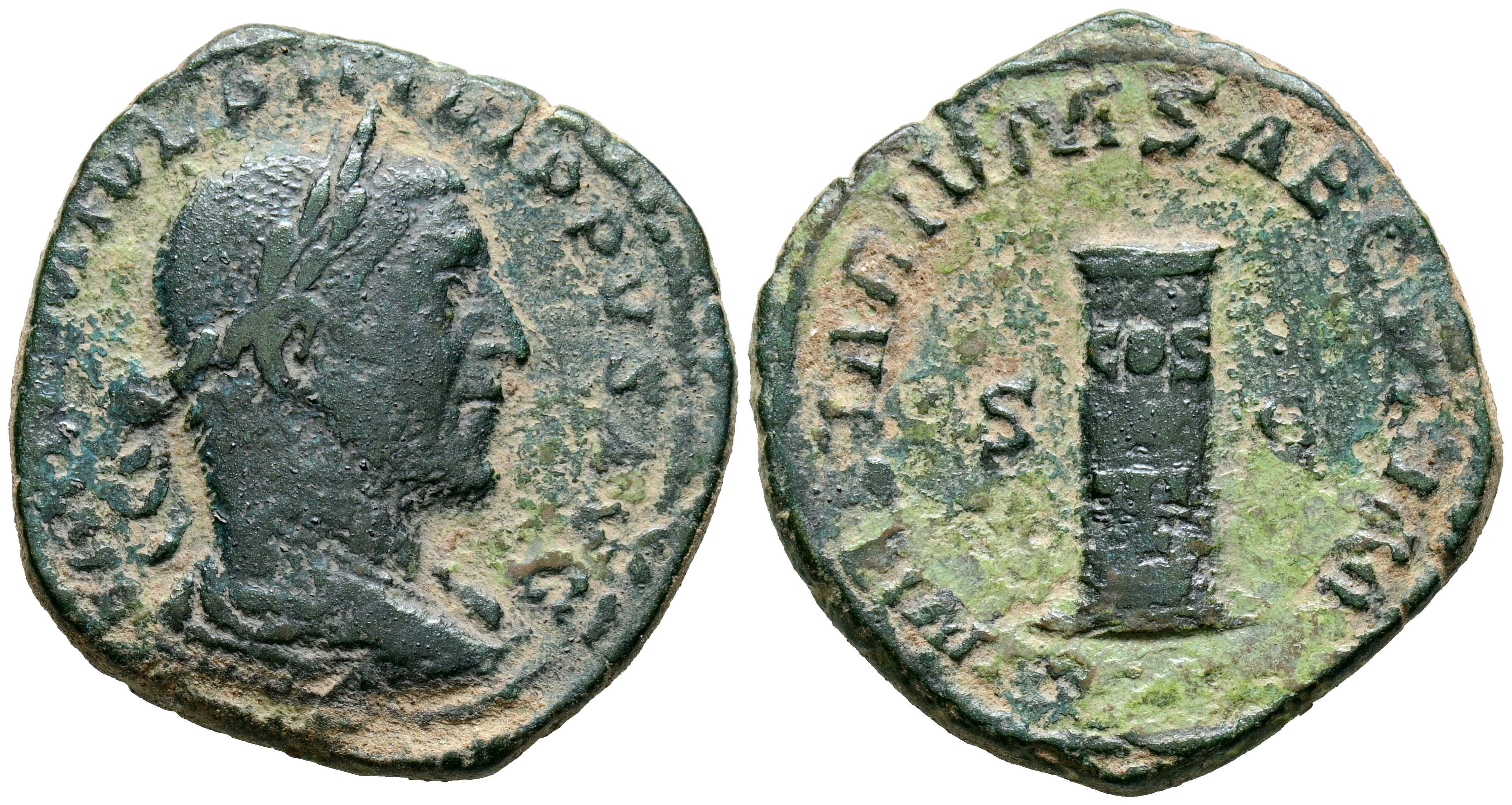FILIPO I. Sestercio. (Ae. 14,02g/31mm). 248 d.C. Roma. (RIC 157a). Anv: Busto laureado y drapeado de Filipo I a derecha, alrededor leyenda: IMP M IVL PHILIPPVS AVG. Rev: Columna con inscripción: COS/III, entre: S-C, alrededor leyenda: MILITARIVM SAECVLVM. MBC-.
