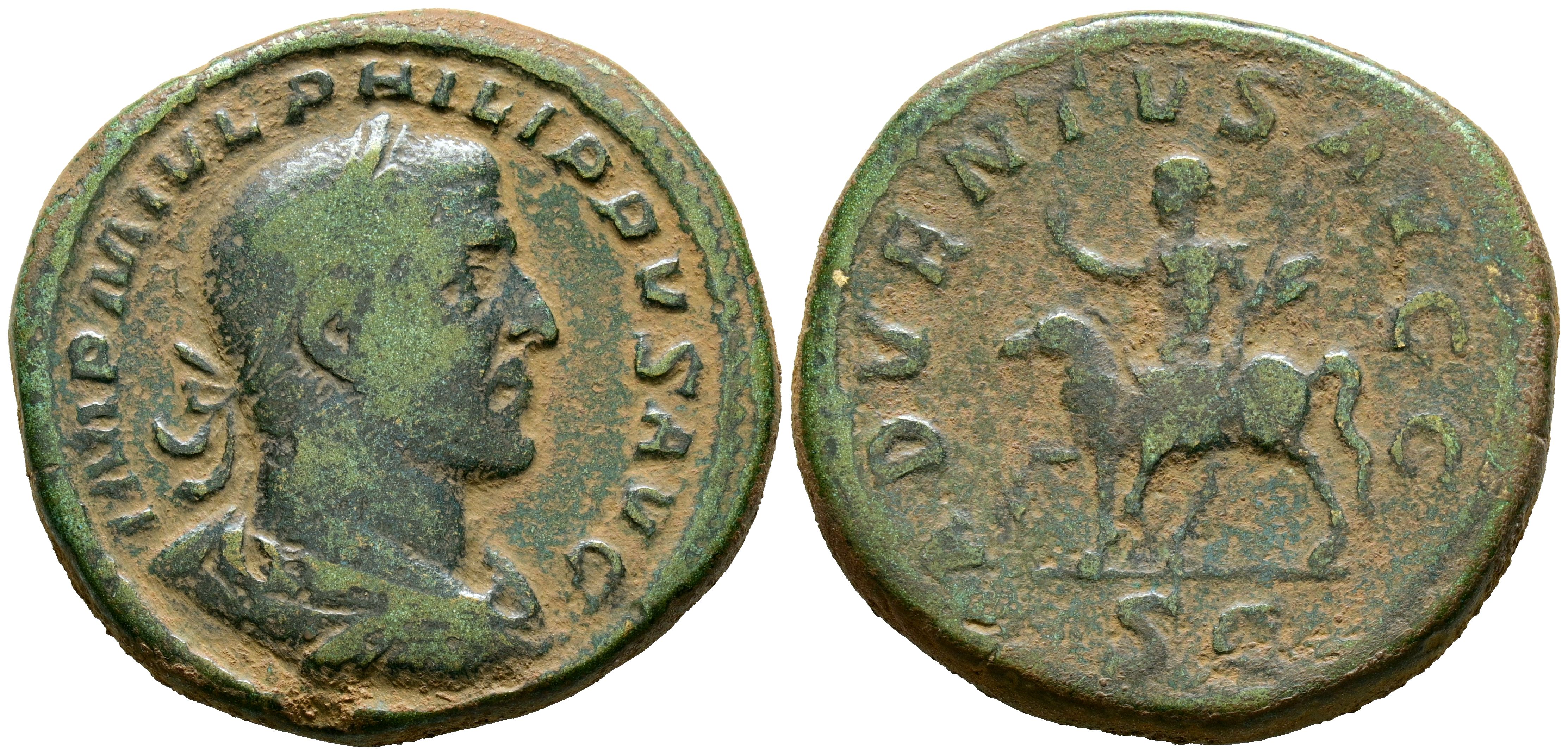 FILIPO I. Sestercio. (Ae. 21,76g/31mm). 244-249 d.C. Roma. (RIC 165). Anv: Busto laureado y drapeado de Filipo I a derecha, alrededor leyenda: IMP M IVL PHILIPPVS AVG. Rev: Filipo I a caballo a izquierda con lanza y levantando mano derecha, debajo: SC, alrededor leyenda: ADVENTVS AVGG. MBC-.