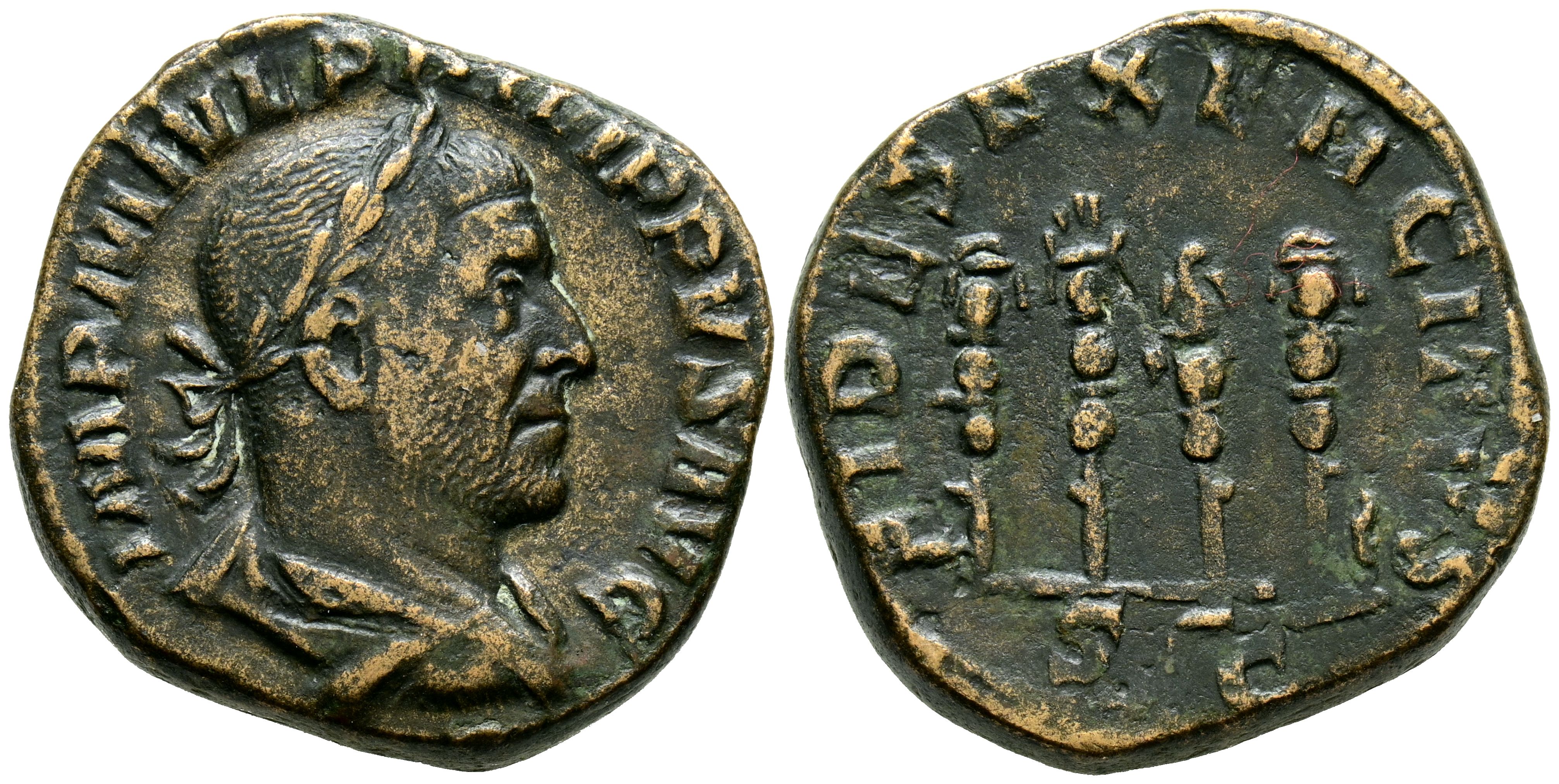 FILIPO I. Sestercio. (Ae. 19,02g/28mm). 244-249 d.C. Roma. (RIC 171a). Anv: Busto laureado y drapeado de Filipo I a derecha, alrededor leyenda: IMP M IVL PHILIPPVS AVG. Rev: Cuatro estandartes, en exergo: SC, alrededor leyenda: FIDES EXERCITVM. MBC.