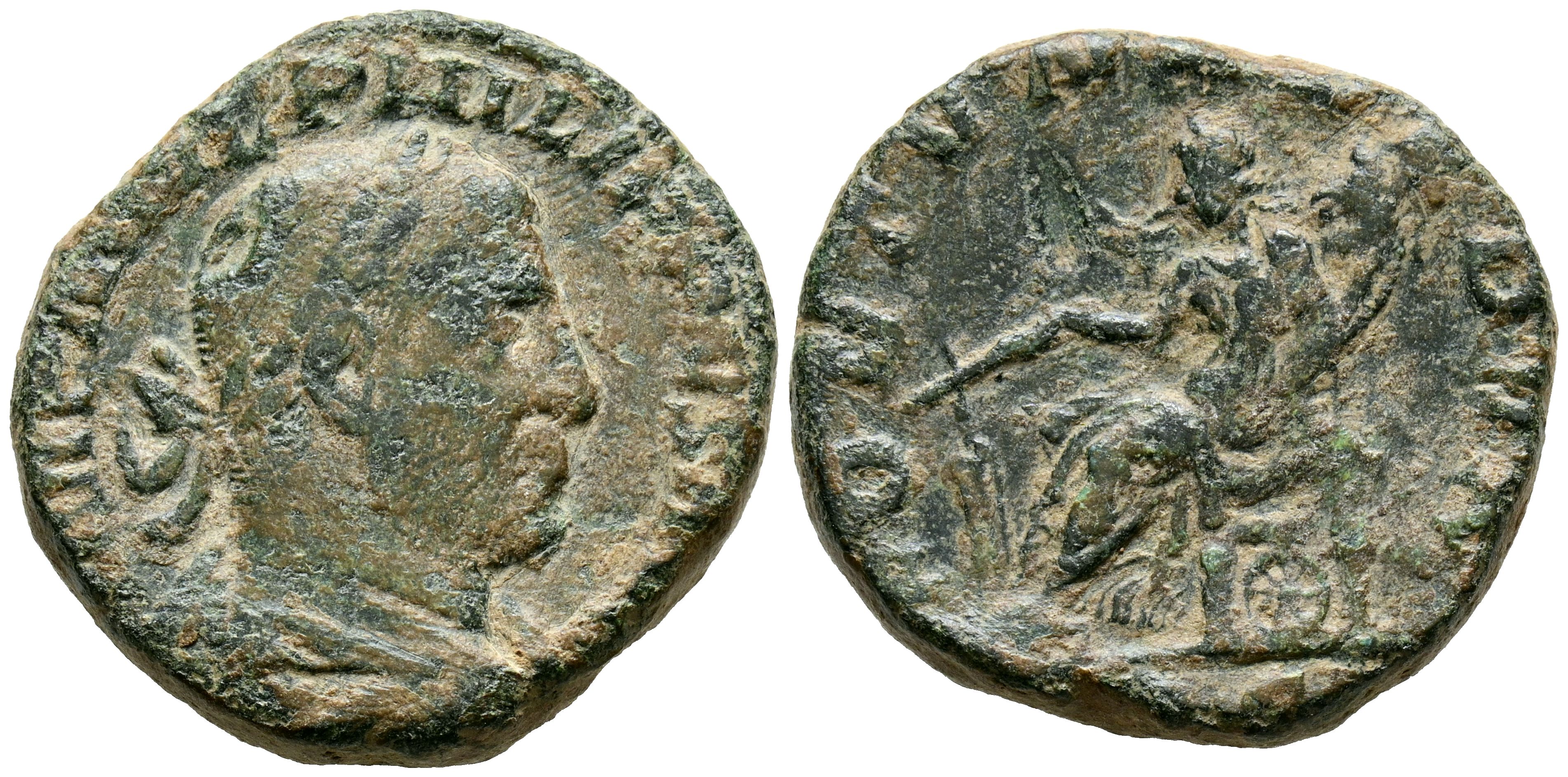 FILIPO I. Sestercio. (Ae. 16,20g/26mm). 249 d.C. Roma. (RIC 174a). Anv: Busto laureado y drapeado de Filipo I a derecha, alrededor leyenda: IPM M IVL PHILIPPVS AVG. Rev: Fortuna sentada a izquierda portando cornucopia y timón, en exergo: SC, alrededor leyenda: FORTVNA REDVX. MBC-.