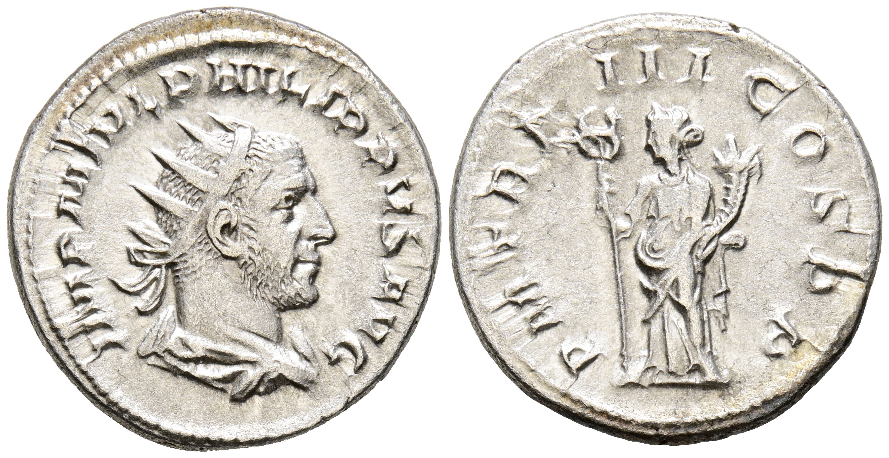 FILIPO I. Antoniniano. (Ar. 4,23g/22mm). 246 d.C. Roma. (RIC 3). Anv: Busto radiado y drapeado de Filipo I a derecha, alrededor leyenda: IMP M IVL PHILIPPVS AVG. Rev: Felicitas estante a izquierda portando caduceo y cornucopia, alrededor leyenda: P M TR P III COS P P. MBC+.