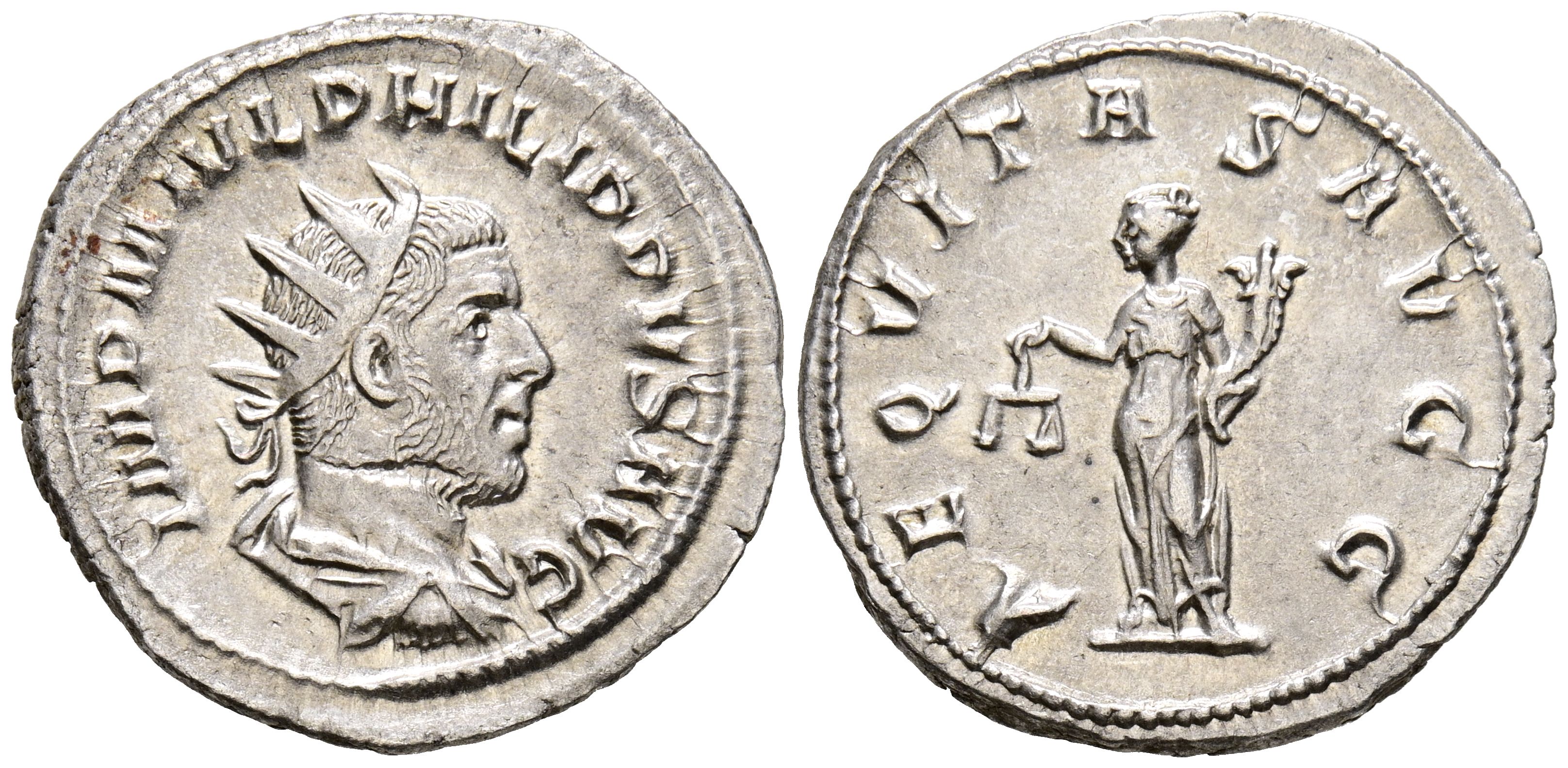FILIPO I. Antoniniano. (Ar. 3,64g/23mm). 244-247 d.C. Roma. (RIC 27b). Anv: Busto radiado y drapeado de Filipo I a derecha, alrededor leyenda: IMP M IVL PHILIPPVS AVG. Rev: Aequitas estante a izquierda portando escalas y cornucopia, alrededor leyenda: AEQVITAS AVGG. EBC-. Restos de brillo original.
