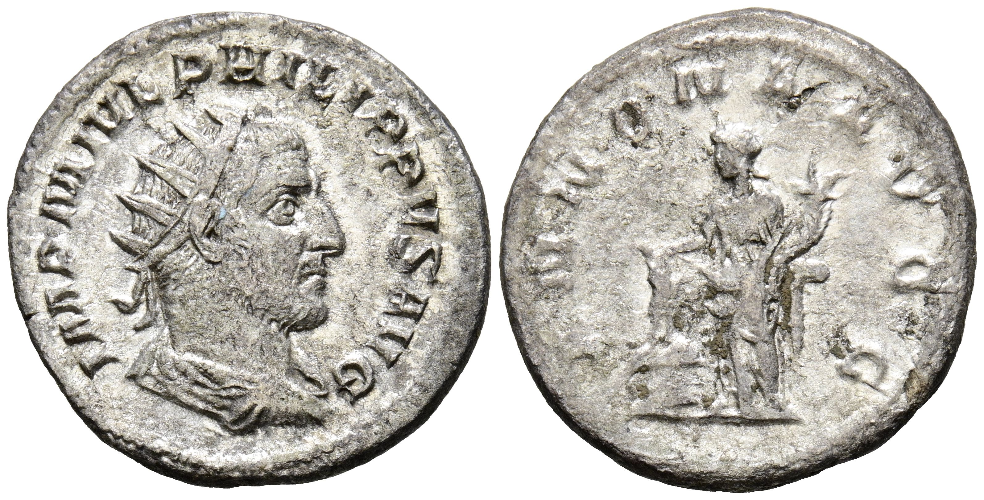FILIPO I. Antoniniano. (Ar. 4,12g/22mm). 247 d.C. Roma. (RIC 28c). Anv: Busto radiado y drapeado de Filipo I a derecha, alrededor leyenda: IMP M IVL PHILIPPVS AVG. Rev: Annona estante a izquierda portando espiga sobre modio y cornucopia, alrededor leyenda: ANNONA AVG. MBC+/MBC.