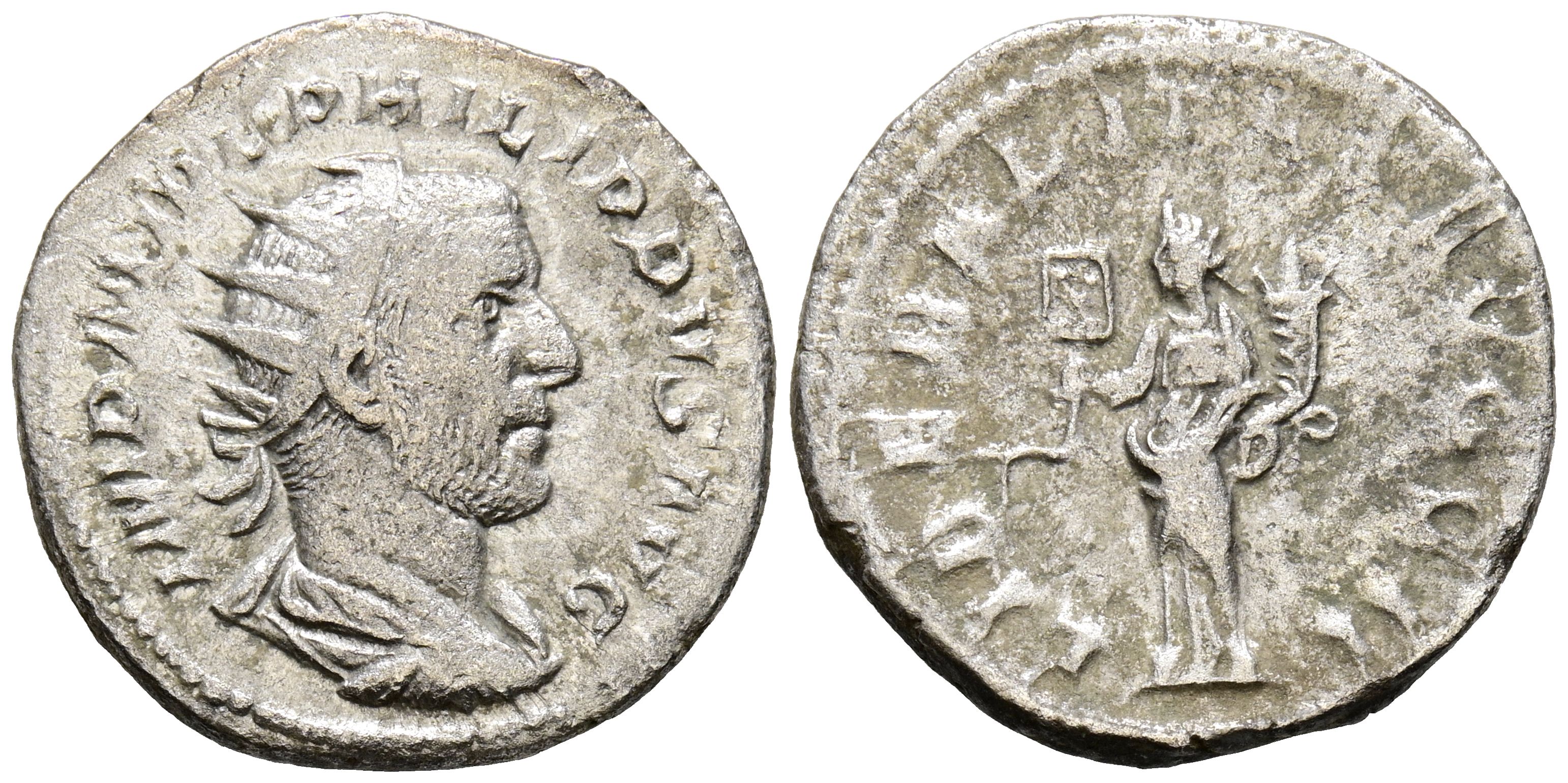 FILIPO I. Antoniniano. (Ar. 3,21g/22mm). 244-247 d.C. Roma. (RIC 38b). Anv: Busto radiado y drapeado de Filipo I a derecha, alrededor leyenda: IMP M IVL PHILIPPVS AVG. Rev: Liberalitas estante a izquierda portando ábaco y cornucopia, alrededor leyenda: LIBERALITAS AVGG II. MBC-.