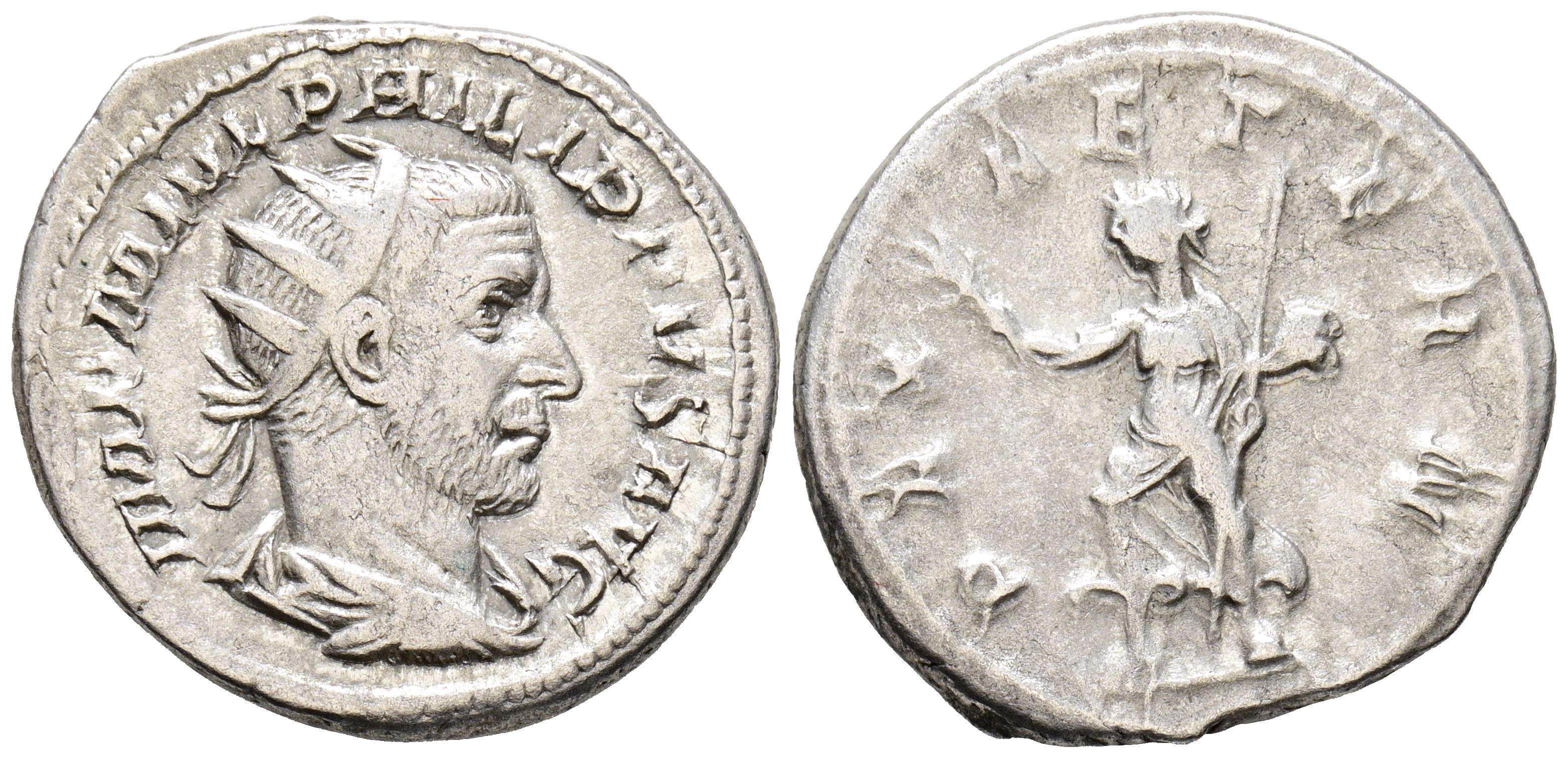 FILIPO I. Antoniniano. (Ar. 4,27g/22mm). 244 d.C. Roma. (RIC 41). Anv: Busto radiado y drapeado de Filipo I a la derecha, alrededor de la leyenda: IMP M IVL PHILIPPVS AVG. Rev: Pax avanzando hacia la izquierda portando rama y cetro, alrededor de la leyenda: PAX AETERN. MBC+/MBC-.