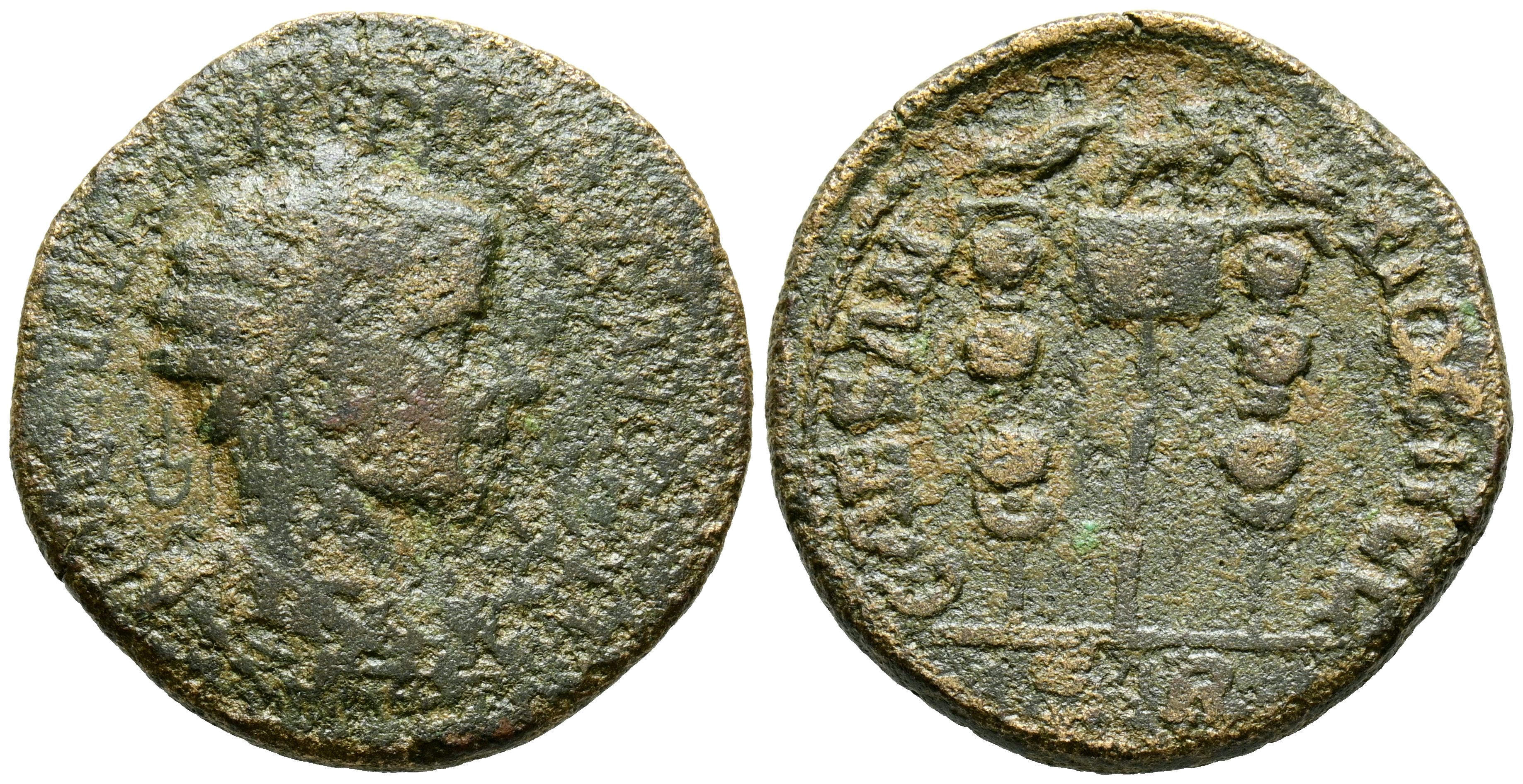 VALERIANO I. AE26. (Ae. 9,05g/26mm). 253-260 d.C. Psidia, Antioquía. (SNG BN 1320). Anv: Busto radiado, drapeado y corazado de Valeriano a derecha, alrededor leyenda: IMP CAE P AELL OVΛEPIΩN. Rev: Aguila sobre vexillum entre dos estandartes, en exetgo: SR, alrededor leyenda: CAES ANTIOCH COL. BC/MBC. Limpiada.
