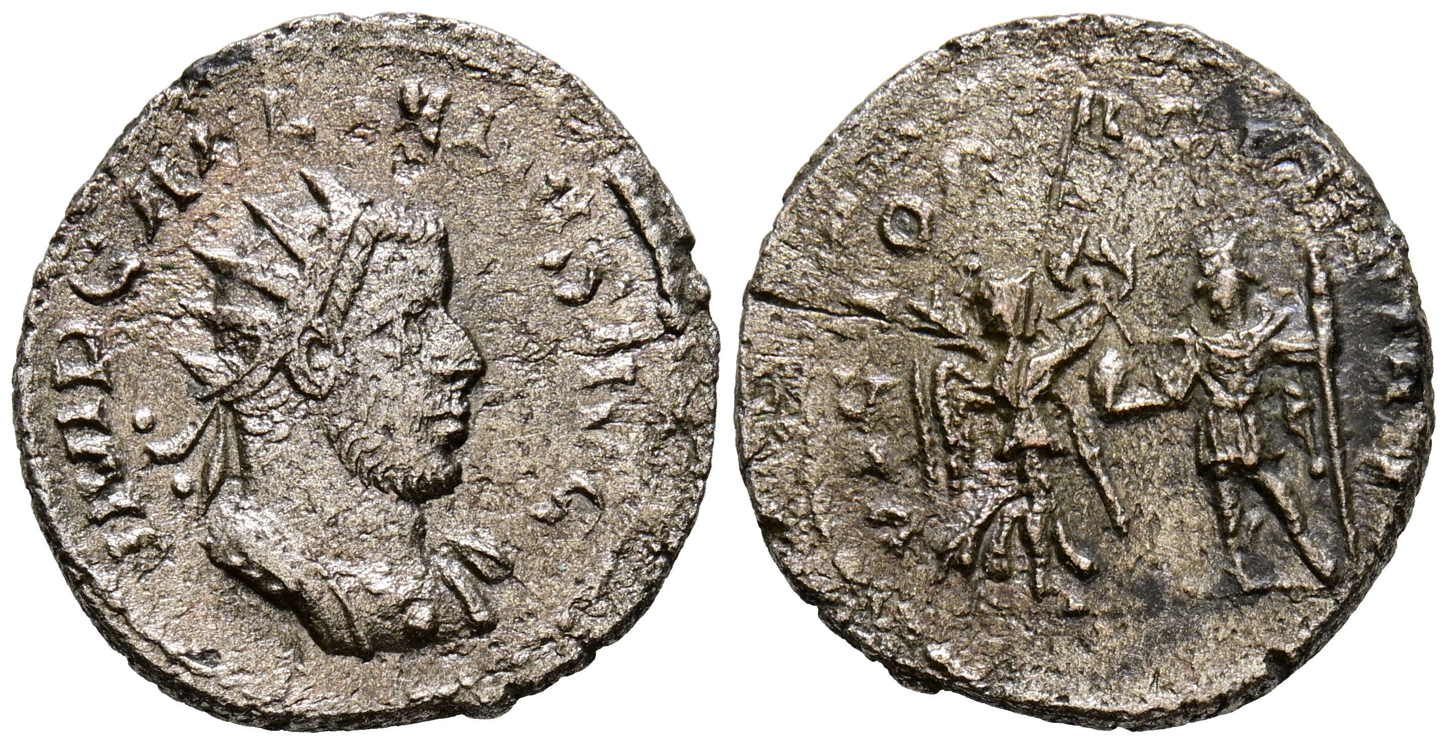 GALIENO. Antoniniano. (Ar. 3,57g/21mm). 256-257 d.C. Antioquía. (RIC 452). Anv: Busto radiado y con coraza de Galieno a la derecha, alrededor leyenda: IMP GALLIENVS AVG. Rev: Galieno estante a izquierda, portando globo y cetro, coronado por Victoria estante a la derecha, alrededor leyenda: VICTORIA GERMAN. MBC.