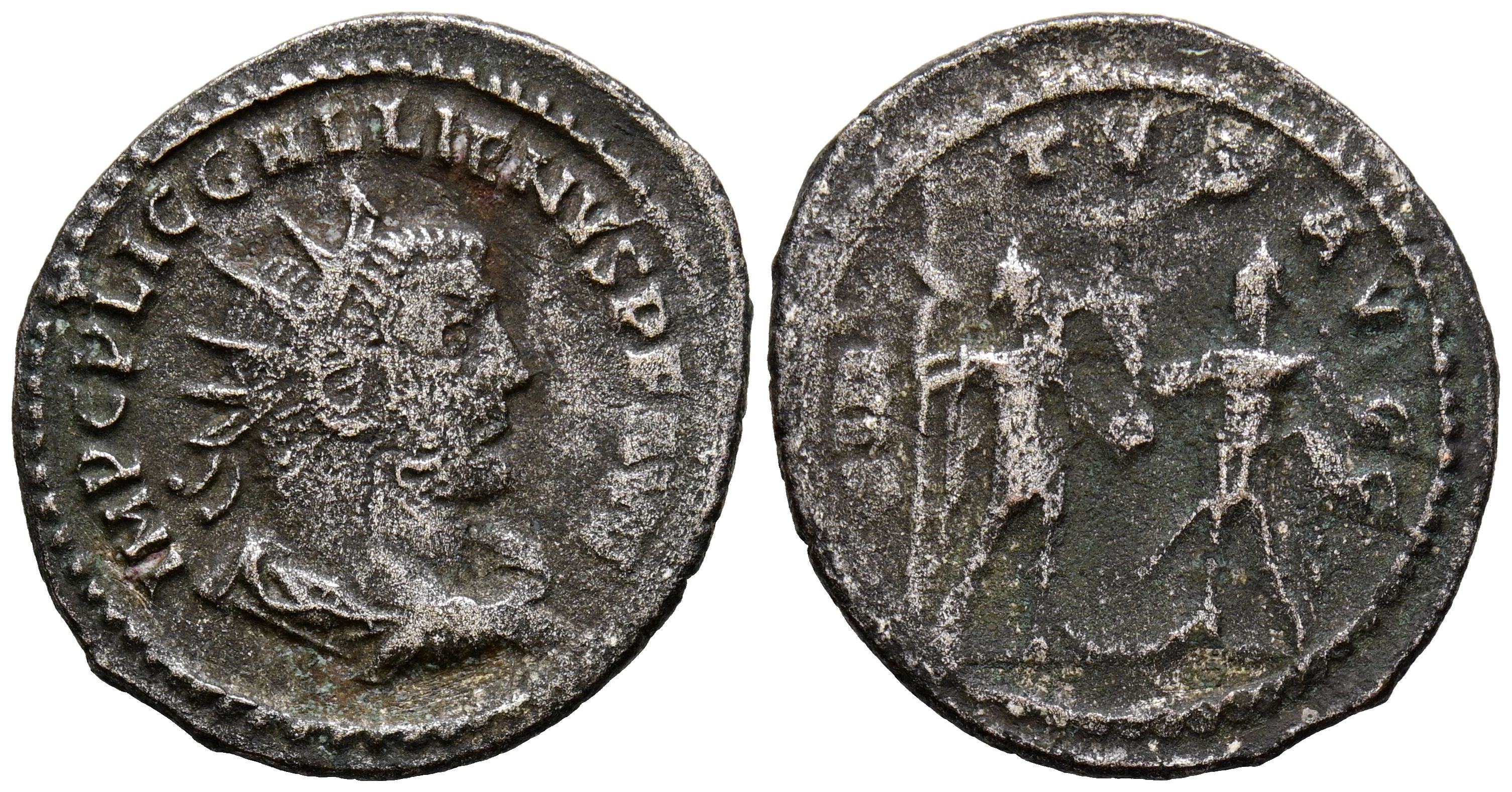 GALIENO. Antoniniano. (Ve. 3,49g/23mm). 255-256 d.C. Antioquía. (RIC 456). Anv: Busto radiado y drapeado de Galieno a derecha, alrededor leyenda: IMP C P LIC GALLIENVS P F AVG. Rev: Galieno y Valeriano enfrentados, uno de ellos sosteniendo lanza y globo, y el otro Victoria y lanza, alrededor leyenda: VIRTVS AVGG. MBC.