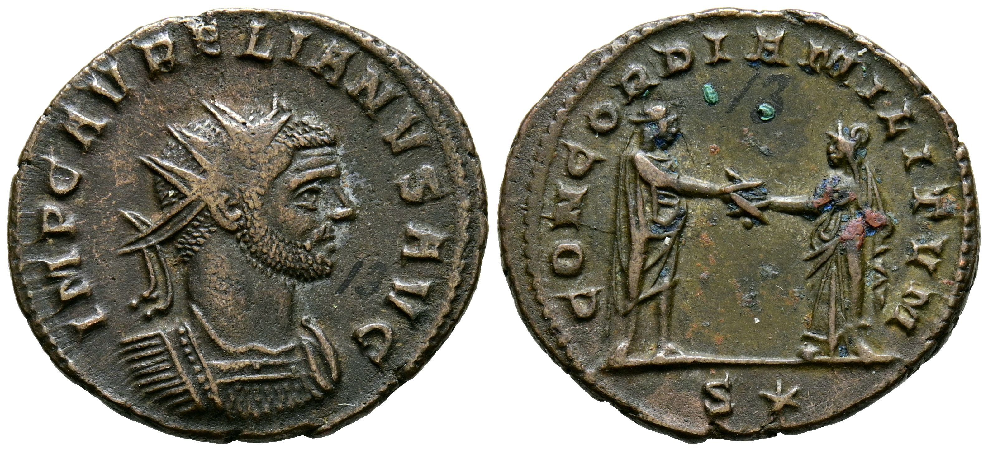 AURELIANO. Antoniniano. (Ae. 3,36g/22mm). 270-275 d.C. Siscia. (RIC 216). Anv: Busto radiado, drapeado y con coraza de Aureliano a derecha, alrededor leyenda: IMP C AURELIANVS AVG. Rev: Aureliano estante a la derecha, estrechando las manos de Concordia, estante a la izquierda, en exergo: S y estrella, alrededor leyenda: CONCORDIA MILITVM. MBC. Puntos de verdín en reverso.