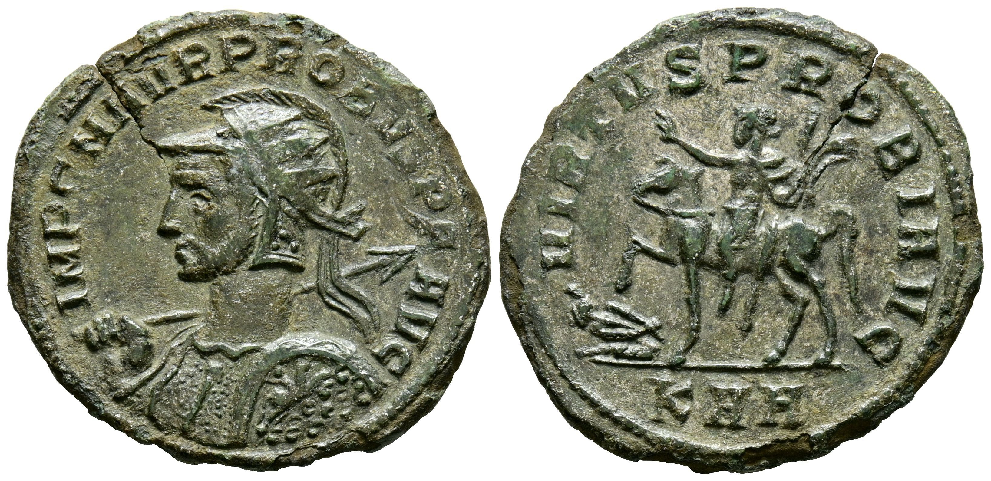 PROBO. Antoniniano. (Ae. 3,23g/18mm). 276-282 d.C. Serdica. (RIC 886). Anv: Busto con casco y coraza a izquierda, portando lanza sobre el hombro y escudo. IMP C M AVR PROBVS P F AVG. Rev: Probo a caballo a izquierda alzando mano derecha y portando cetro, a sus pies cautivo, en exergo KAA, alrededor leyenda: VIRTVS PROBI AVG. MBC.