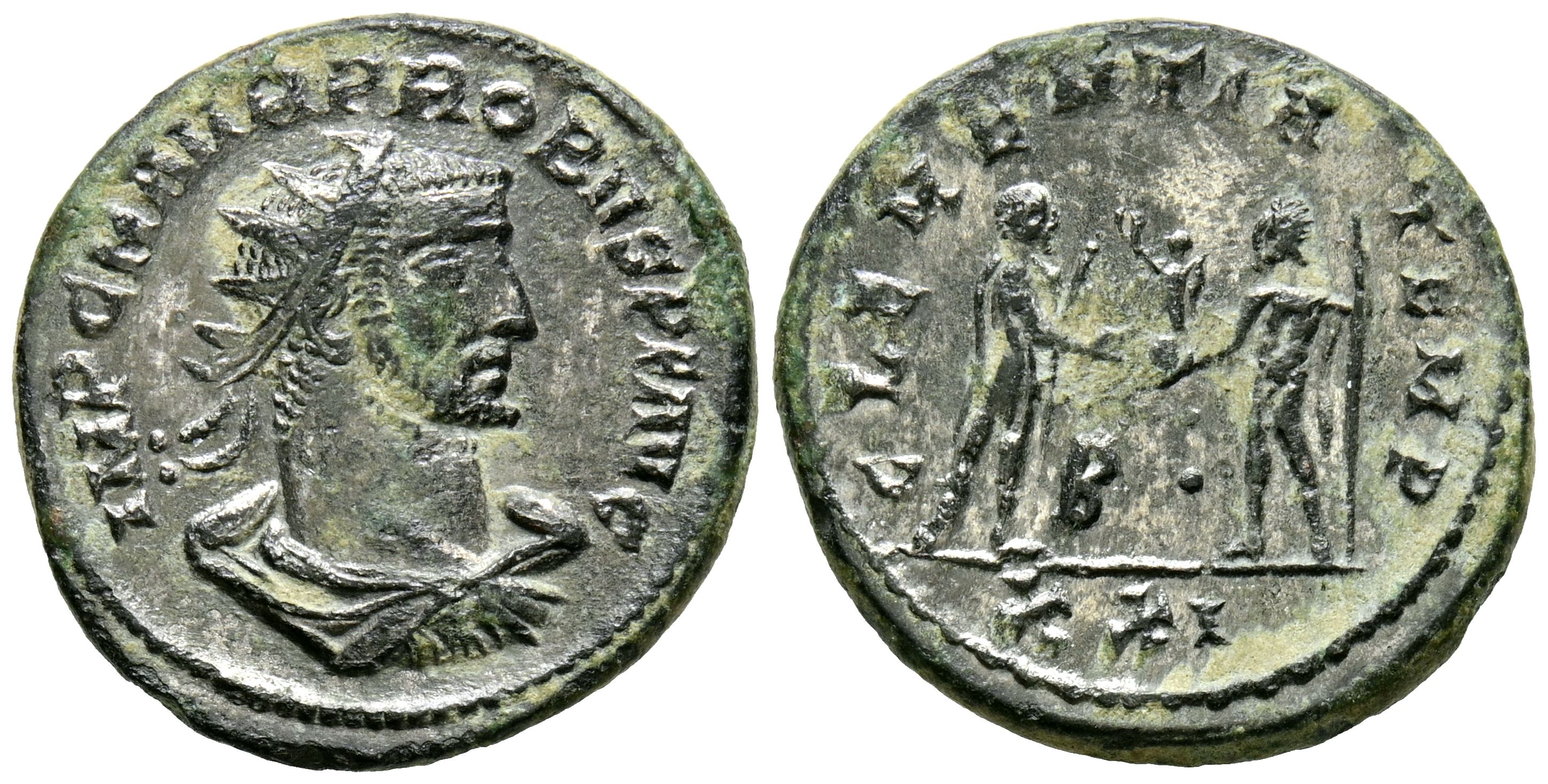 PROBO. Antoniniano. (Ae. 3,72g/21mm). 276 d.C. Antioquía. (RIC 920). Anv: Busto radiado, drapeado y con coraza de Probo a derecha, alrededor leyenda: IMP C MAN PROBVS P F AVG. Rev: Júpiter ofreciendo corona de laurel a Probo portando cetro, entre ellos: B, en exergo: XXI, alrededor leyenda: CLEMENTIA TEMP. MBC+. Ligeros restos de plateado original.