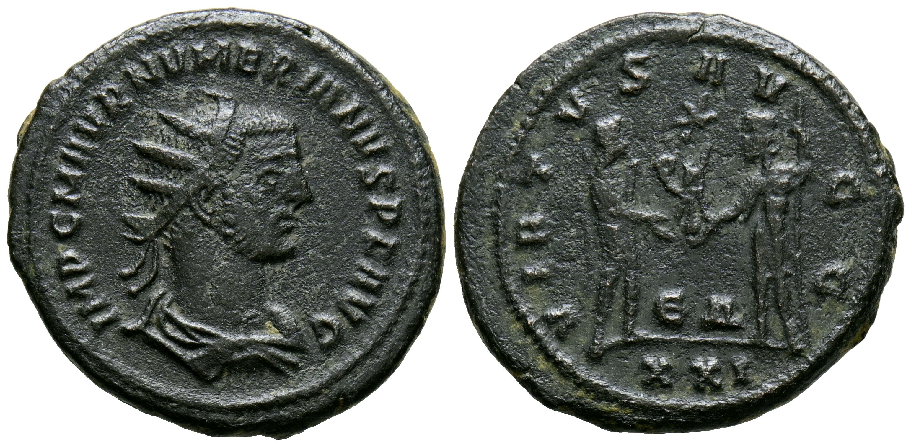 NUMERIANO. Antoniniano. (Ve. 4,66g/21mm). 283-284 d.C. Antioquía. (RIC 466). Anv: Busto radiado y drapeado de Numeriano a derecha, alrededor leyenda: IMP C M AVR NVMERIANVS P F AVG. Rev: Numeriano estante a derecha portando cetro y recibiendo Victoria con corona de laurel sobre globo de Júpiter estante a izquierda portando cetro, entre ellos: EA, en exergo: XXI, alrededor leyenda: VIRTVS AVGG. MBC.