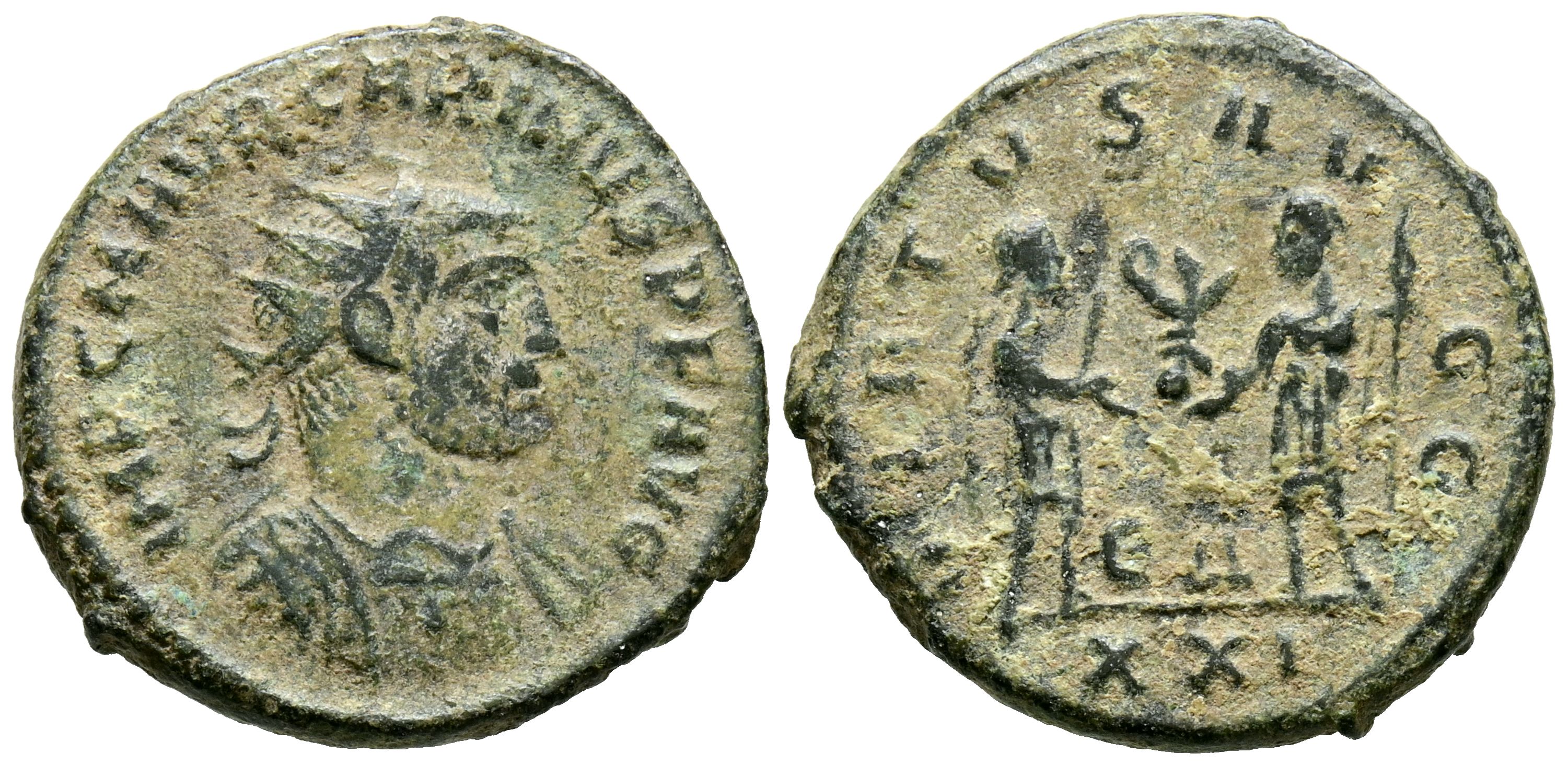 CARINO. Antoniniano. (Ae. 4,53g/21mm). 283-285 d.C. Cícico. (RIC 235). Anv: Busto radiado y drapeado de Carino a derecha, alrededor leyenda: IMP M AVR CARINVS P F AVG. Rev: Carino estante a derecha recibiendo Victoria de Júpiter estante a izquierda portando cetro, entre ellos EA, en exergo: XXI, alrededor leyenda: VIRTVS AVGG. MBC-.
