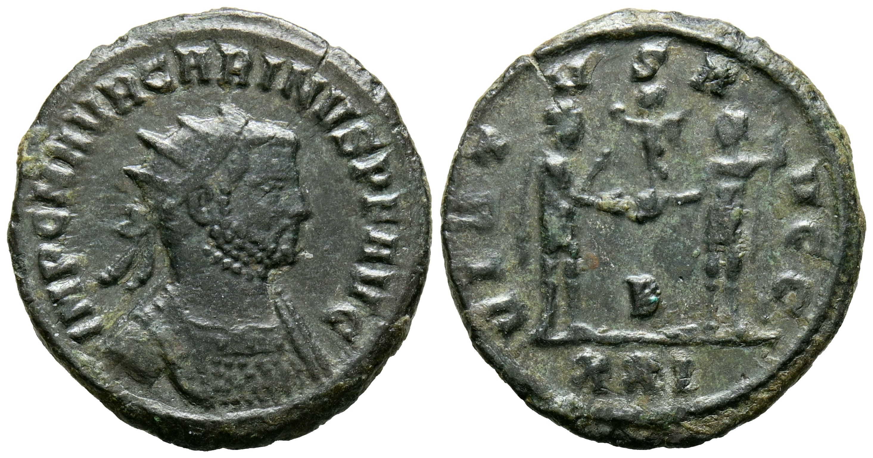 CARINO. Antoniniano. (Ae. 3,52g/21mm). 282-283 d.C. Trípolis. (RIC 325). Anv: Busto radiado y con coraza de Carino a derecha, alrededor leyenda: IMP C M AVR CARINVS NOB C. Rev: Carino estante a derecha sosteniendo Parazonium y recibiendo Victoria sobre globo de Júpiter a izquierda, entre ellos B, en exergo XXI, alrededor leyenda: VIRTVS AVGG. MBC.