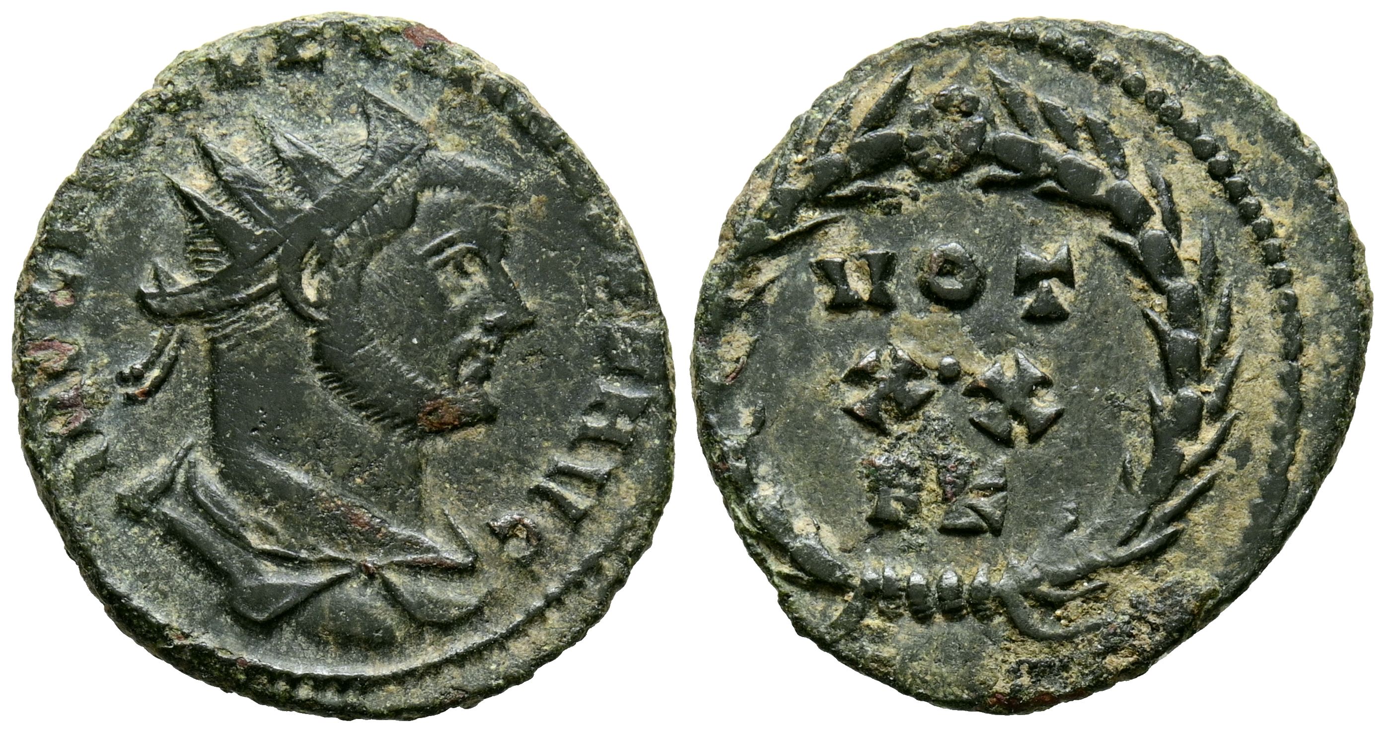 DIOCLECIANO. Antoniniano. (Ae. 3,79g/21mm). 303 d.C. Cártago. (RIC 38). Anv: Busto radiado y drapeado a la derecha de Diocleciano, alrededor leyenda: IMP C DIOCLECIANVS P F AVG. Rev: Corona de laurel, leyenda: VOT/XX/FK. MBC.
