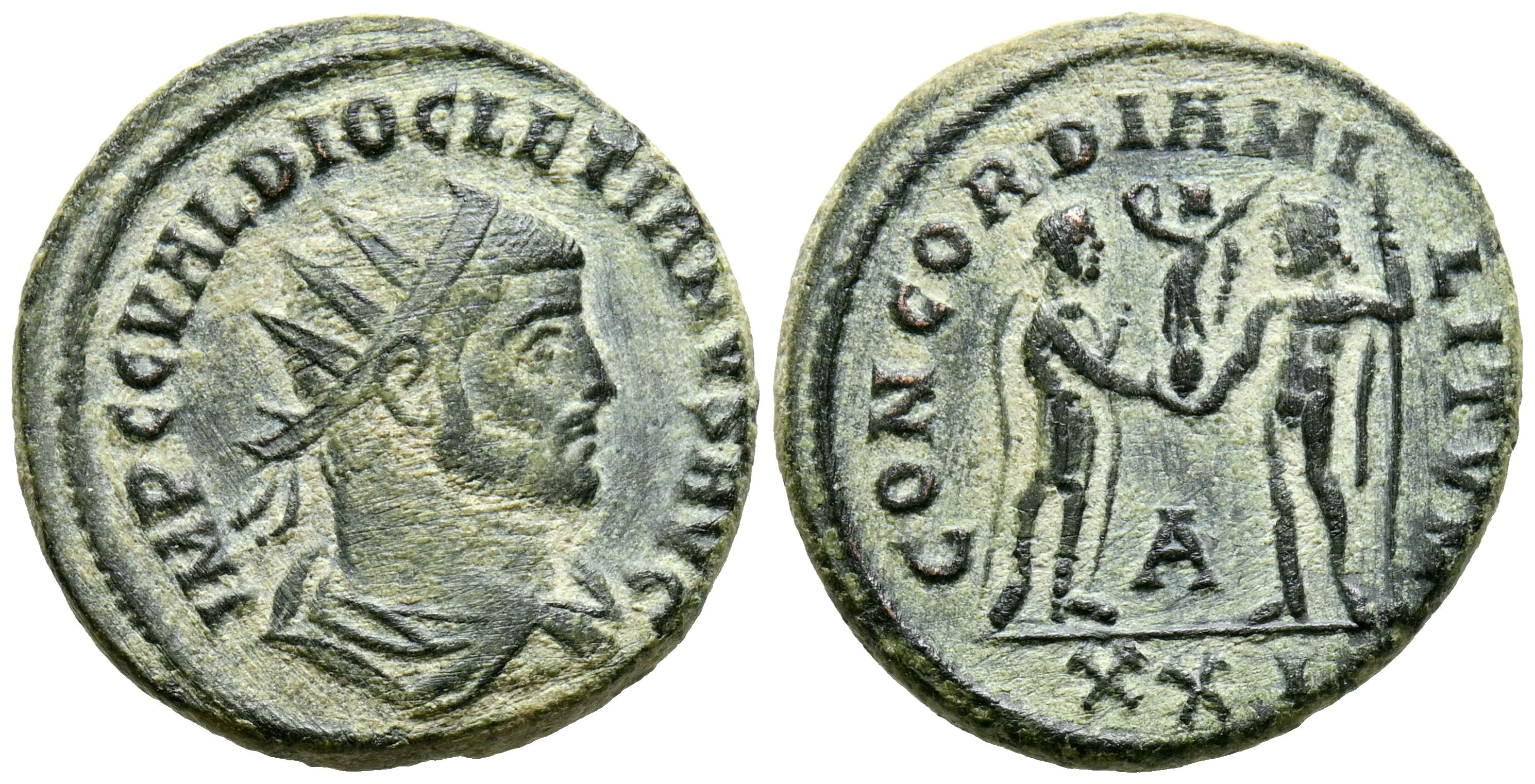 DIOCLECIANO. Antoniniano. (Ae. 4,66g/21mm). 284-294 d.C. Cícico. (RIC 306). Anv: Busto radiado, drapeado y con coraza de Diocleciano a derecha, alrededor leyenda: IMP C C VAL DIOCLETIANVS AVG. Rev: Diocleciano estante a derecha recibiendo Victoria con corona de laurel de Júpiter estante a izquierda con cetro, entre ellos A, en exergo: XXI, alrededor leyenda: CONCORDIA MILITVM. MBC-.