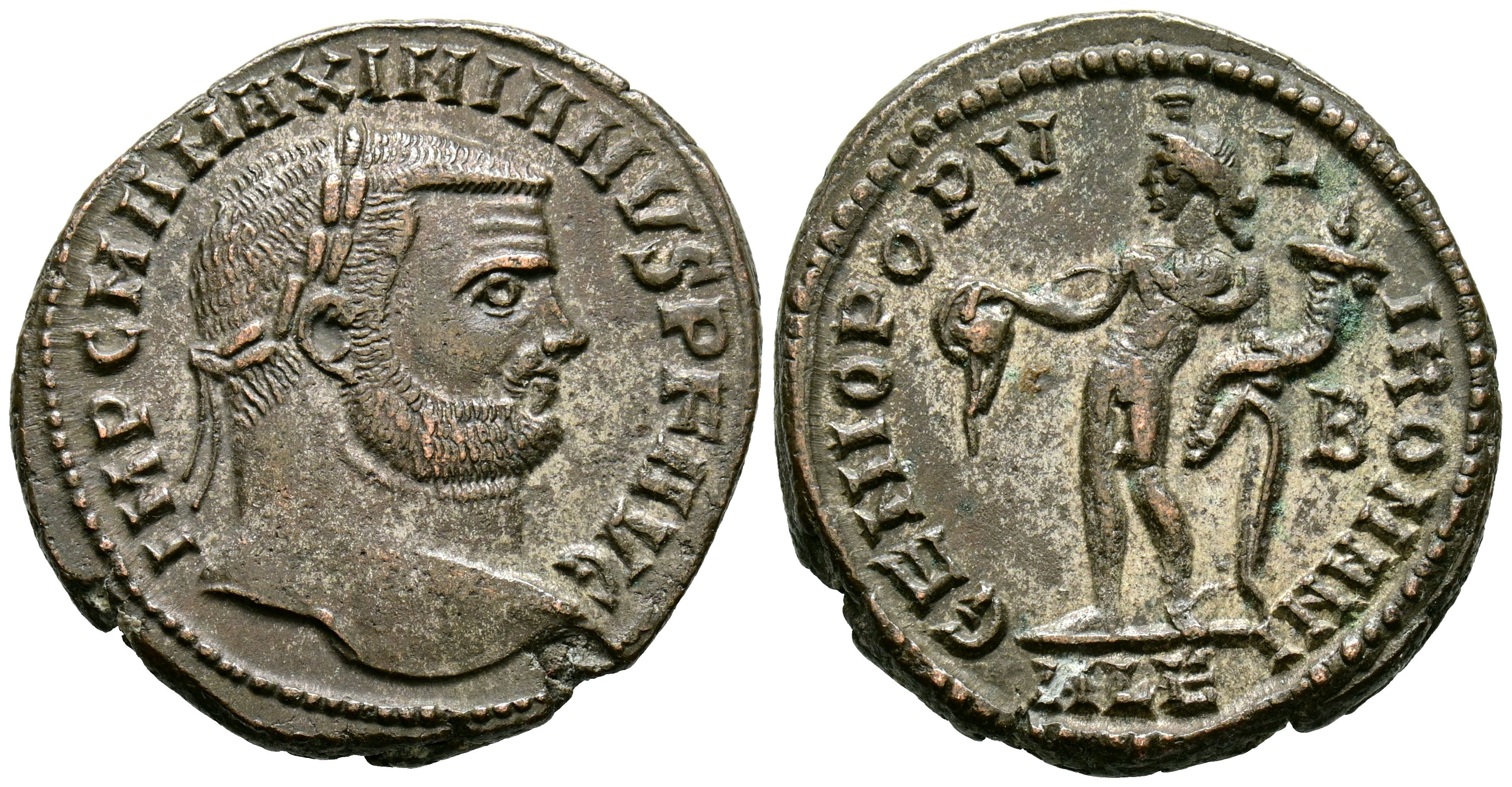 MAXIMIANO HERCULEO. Follis. (Ae. 11,40g/30mm). 294 d.C. Alejandría. (RIC 14b). Anv: Cabeza laureada de Maximiano Herculeo a derecha, alrededor leyenda: IMP C MA MAXIMIANVS P F AVG. Rev: Genio estante a izquierda portando patera y cornucopia, en campo: B, en exergo: ALE, alrededor leyenda: GENIO POPVLI ROMANI. EBC-.