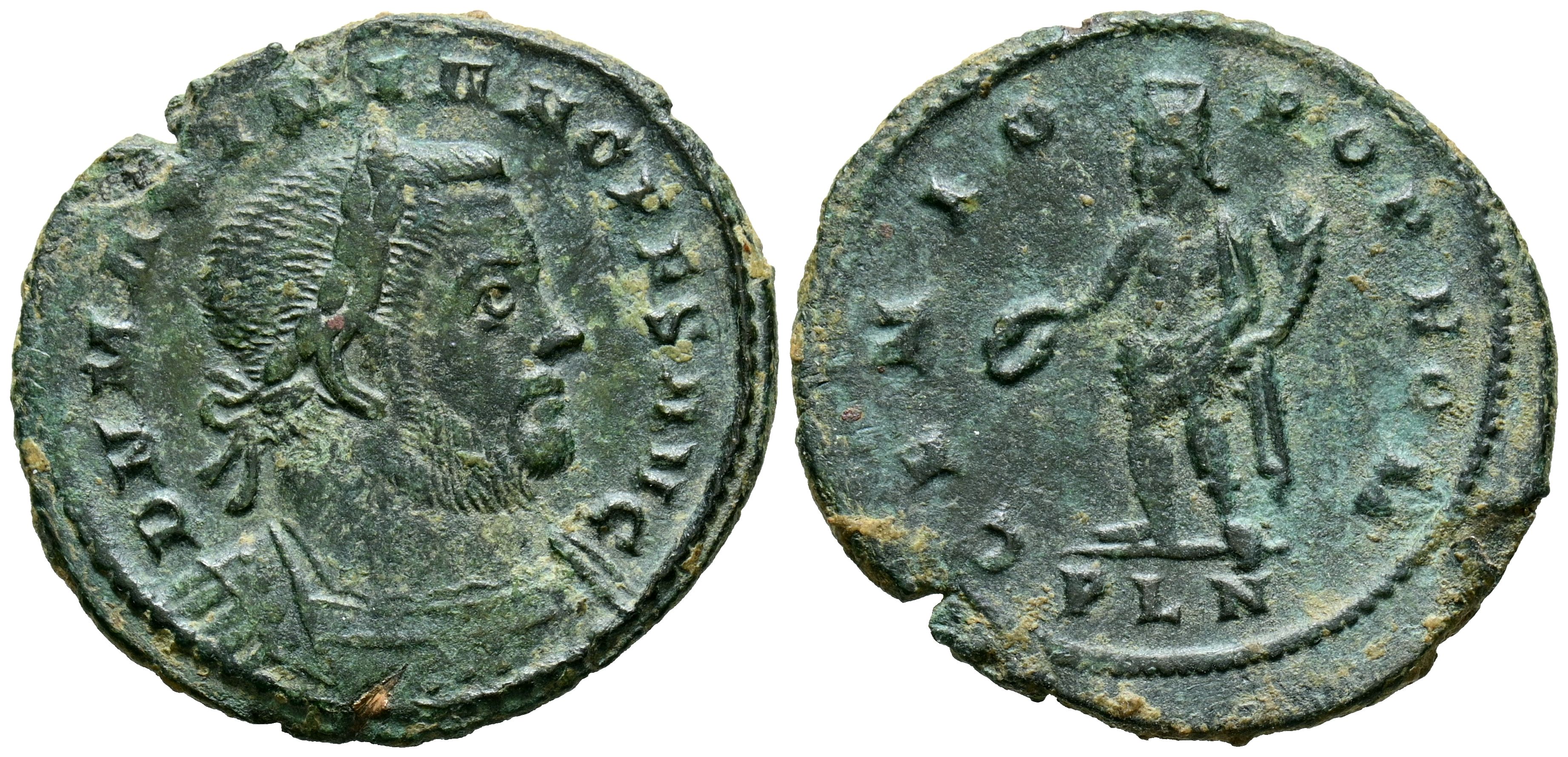 MAXIMIANO I. Follis. (Ae. 5,18g/26mm). 307 d.C. Lugdunum. (RIC 224). Anv: Cabeza laureada de Maximiano I a derecha, alrededor leyenda: D N MAXIMIANO P F S AVG. Rev: Genio estante a izquierda portando patera y cornucopia, en exergo: PLN, alrededor leyenda: GENIO POP ROM. MBC.