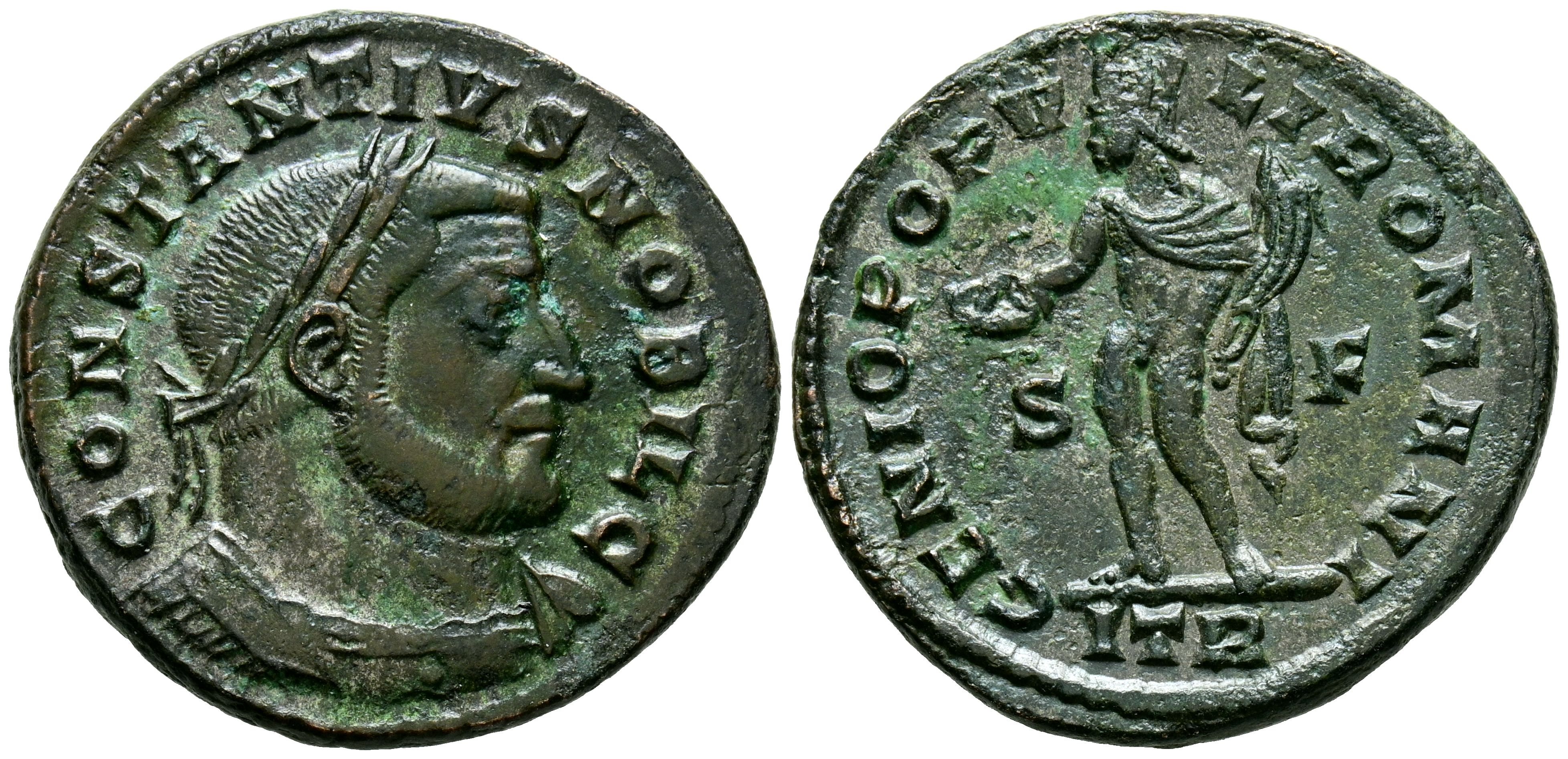 CONSTANCIO I. Follis. (Ae. 9,03g/28mm). 302-303 d.C. Treveri. (RIC 508a). Anv: Busto laureado y con coraza de Constancio I a derecha, alrededor leyenda: CONSTANTIVS NOBIL C. Rev: Genio estante a izquierda portando patera y cornucopia, entre: S-F, en exergo: ITR, alrededor leyenda: GENIO POPVLI ROMANI. MBC+.